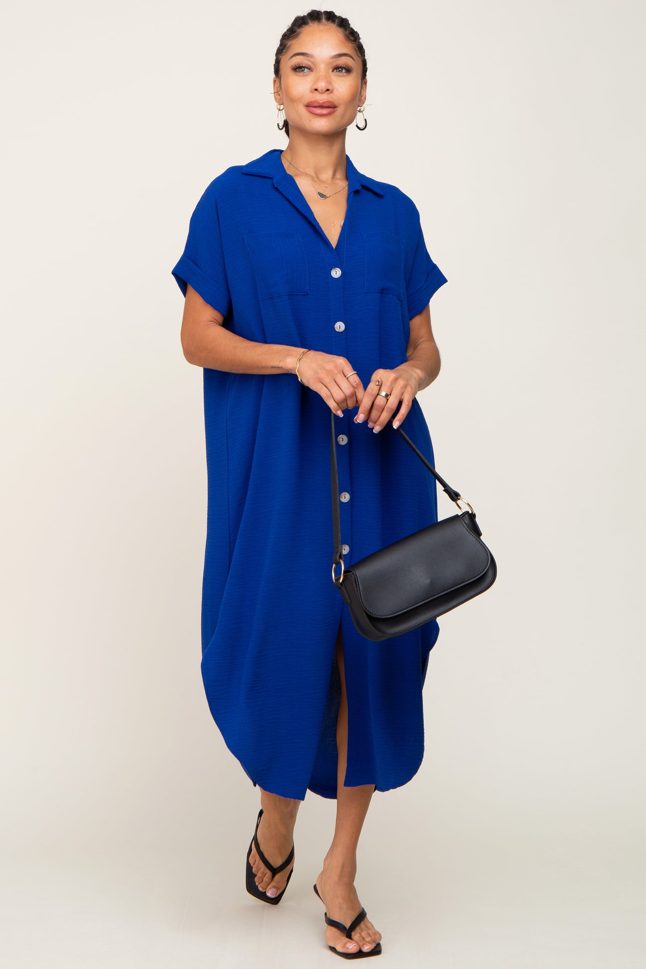 A solid maxi dress featuring functioning front buttons, a collar, two front pockets, cuffed short dolman sleeves, and a hi-low rounded hemline.