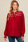 Elevate your maternity wardrobe with our Rust Embroidered Smocked Maternity Blouse. Crafted from lightweight, breathable fabric, this blouse offers all-day comfort and style. The rich rust color adds warmth and vibrancy, while delicate white embroidered smocking across the chest creates a charming, boho-inspired look. Designed with long, billowy sleeves finished with smocked cuffs, this blouse effortlessly accommodates your growing bump. The button-front detail allows for easy wear and nursing access, making it a versatile piece for pregnancy and beyond. Pair it with your favorite jeans for a casual day out or dress it up with tailored pants for a chic, put-together look. Soft, stylish, and perfect for any season!