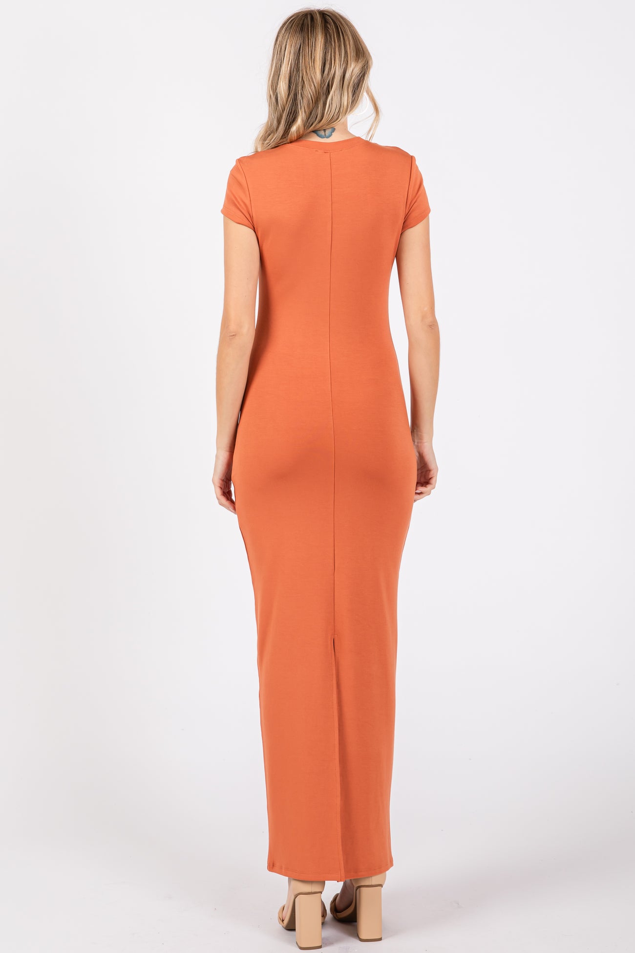 A solid fitted maxi dress featuring short sleeves and a rounded neckline.