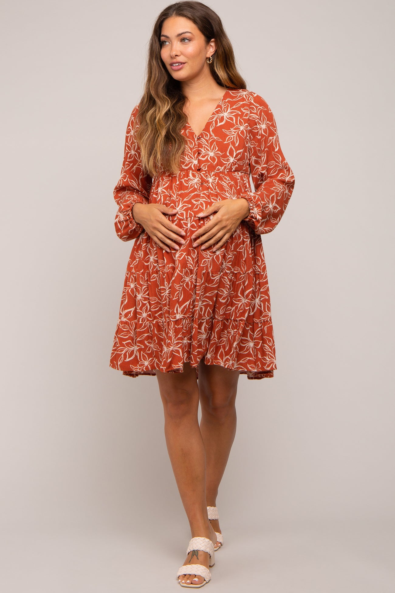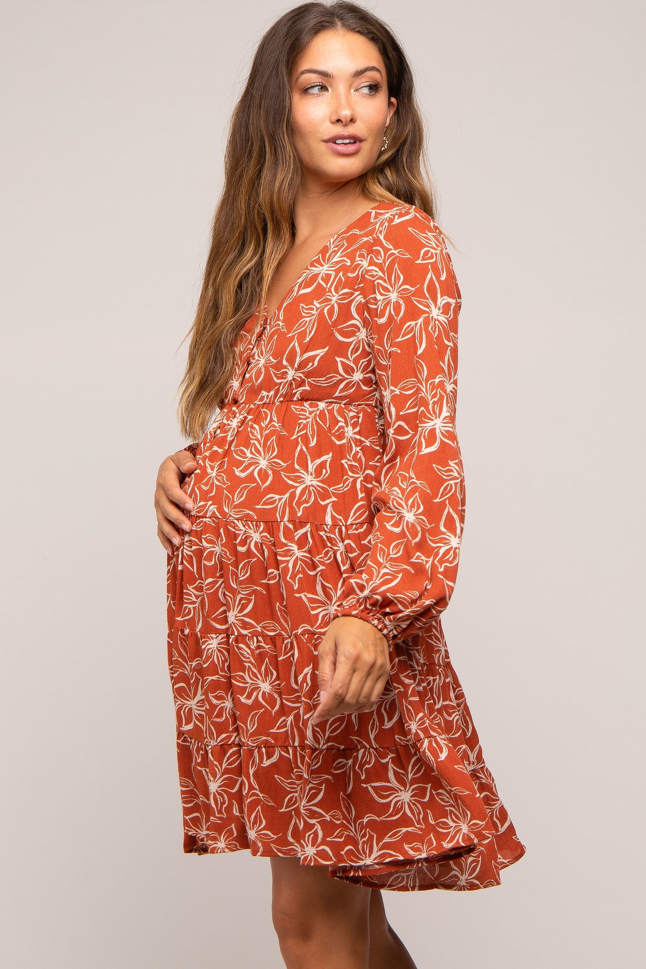A floral print maternity dress featuring a v-neckline, a button front, a tiered skirt, long sleeves and double lining.