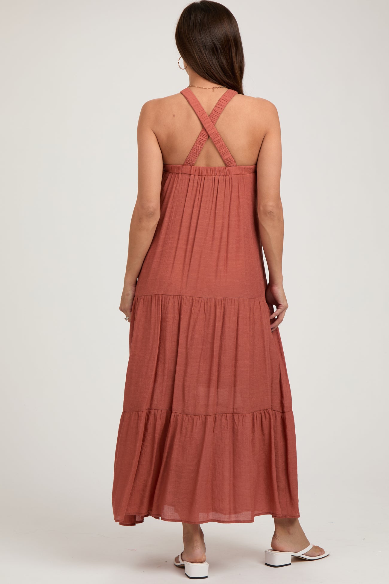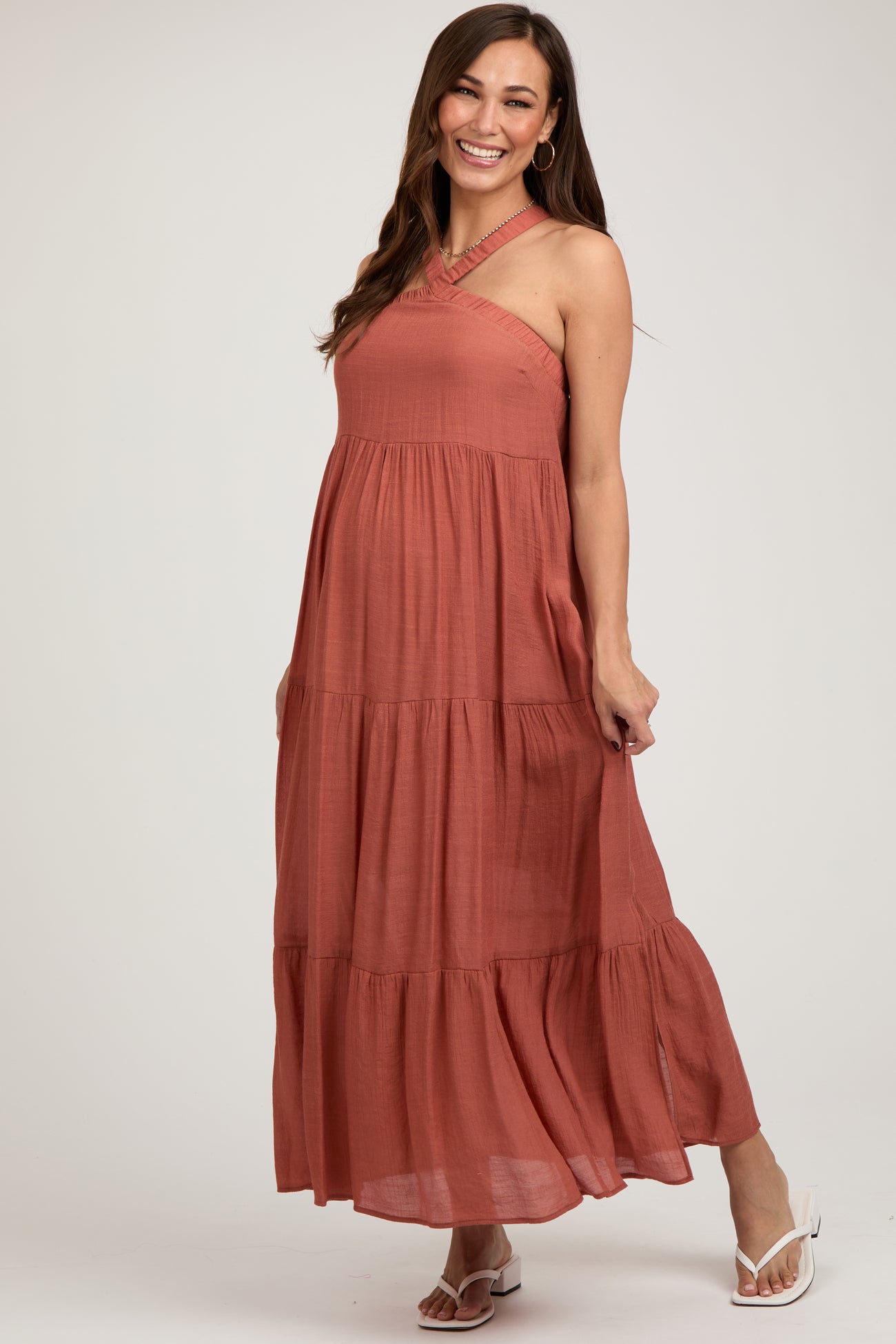 A sleeveless tiered maternity maxi dress featuring a halter neckline, a side slit and double lining.