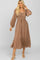Details A printed midi dress featuring a sweetheart neckline, a smocked bodice, long cinched sleeves, and a front tie accent. Content + Care