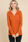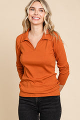 A ribbed fitted top featuring long sleeves and a collared v-neckline.