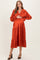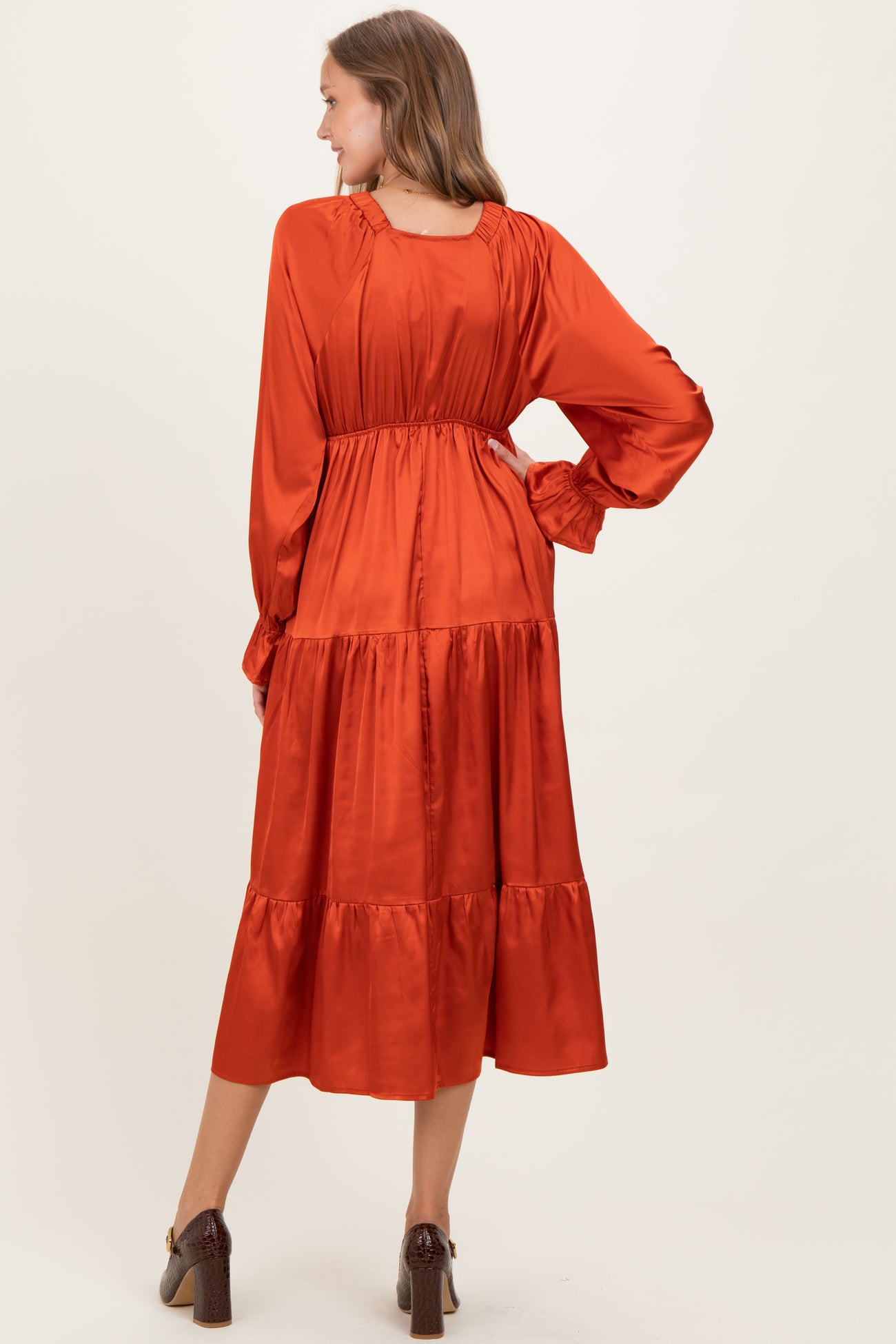 Rust Solid V-Neck Satin Long Sleeve Maternity Maxi Dress