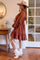 A solid short maternity dress with a deep v-neckline, button and cinching detail on bodice, bubble sleeves and ruffle hem. Dress is partially lined.