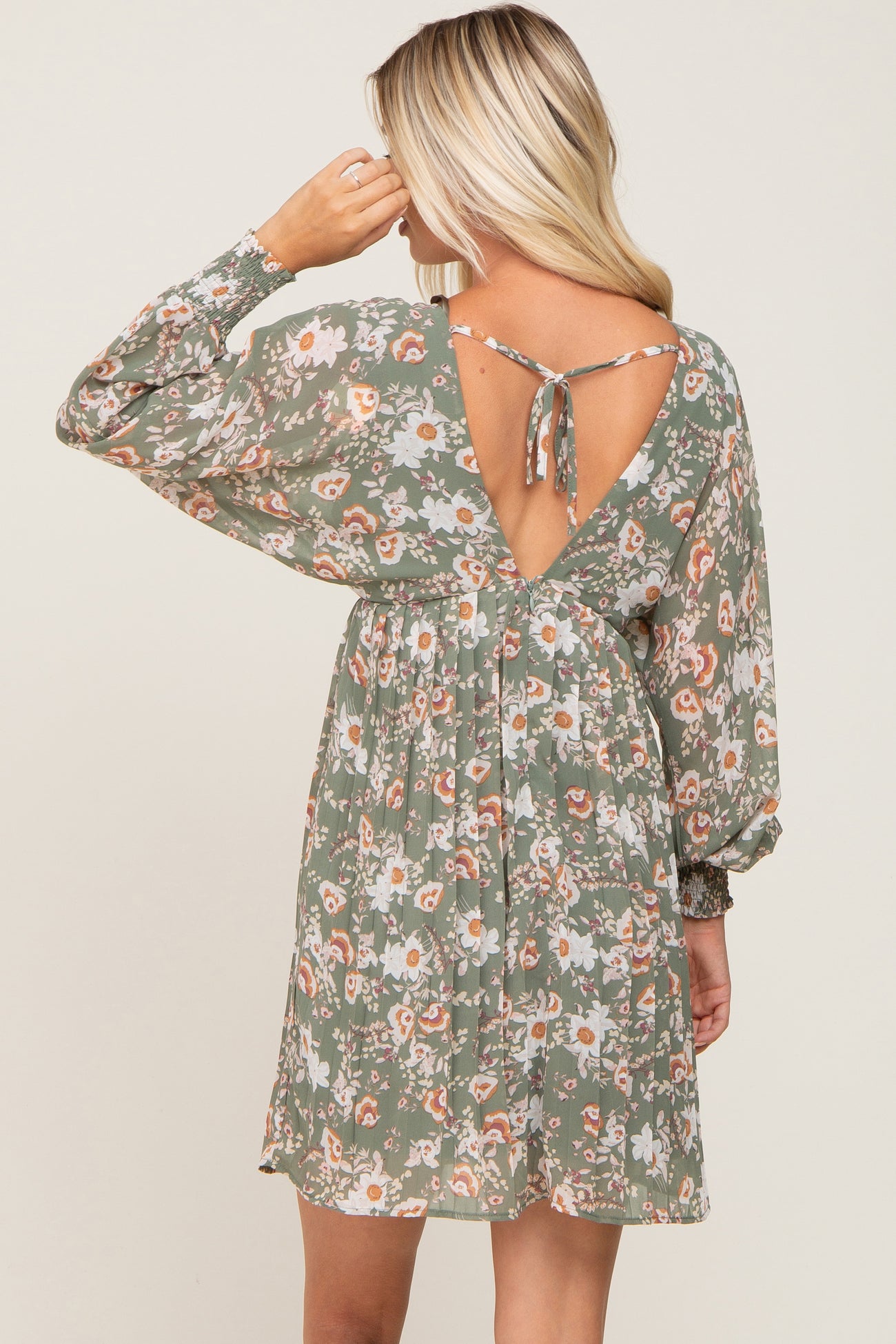 Sage Floral Chiffon Pleated Long Sleeve Dress