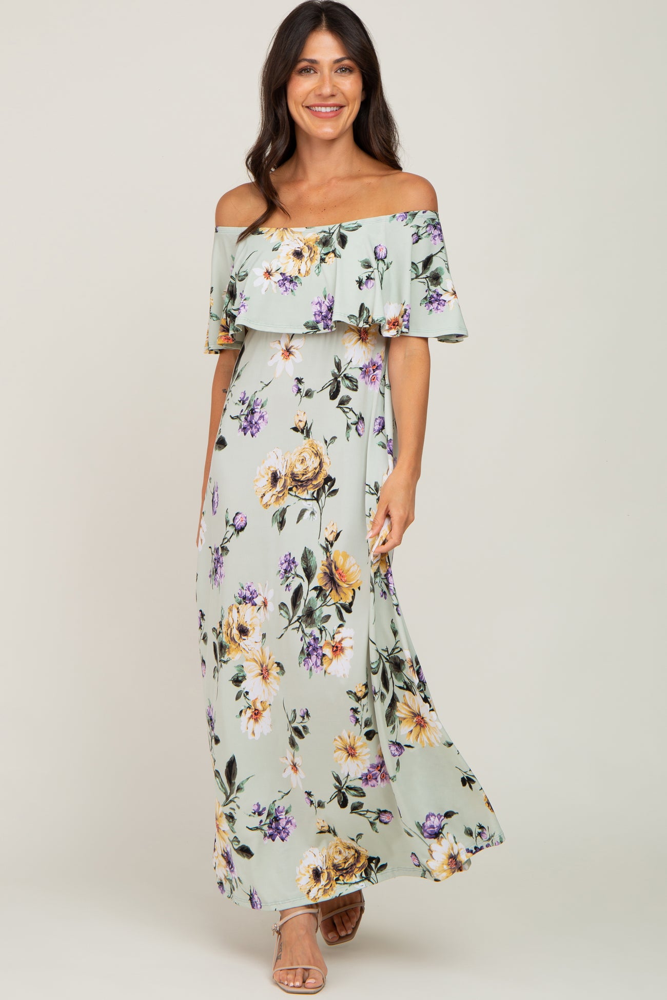 Details A floral maxi dress featuring a fold-over off shoulder neckline. Content + Care