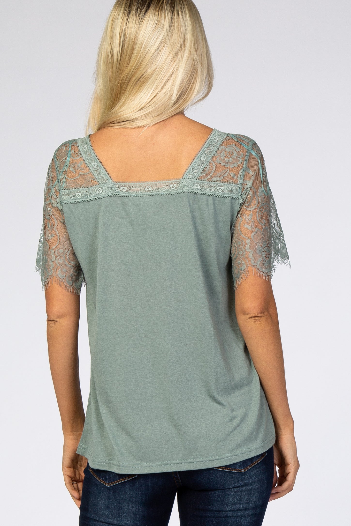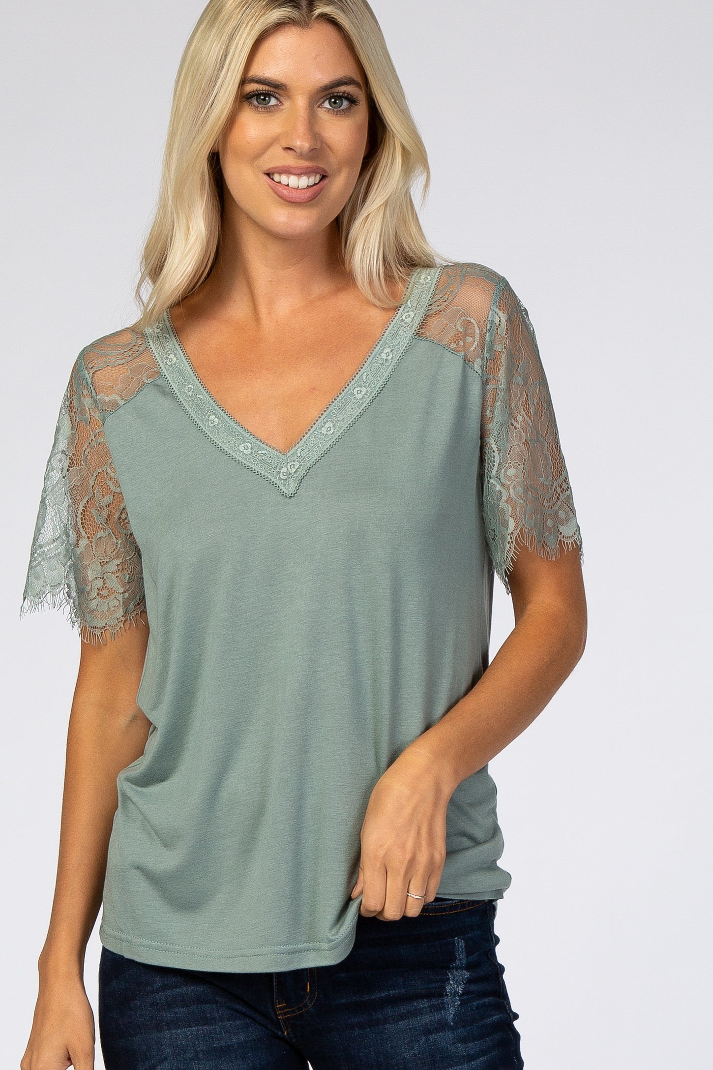 Details A solid hued top featuring short lace sleeves, a v-neckline., and lace along the neckline Content + Care