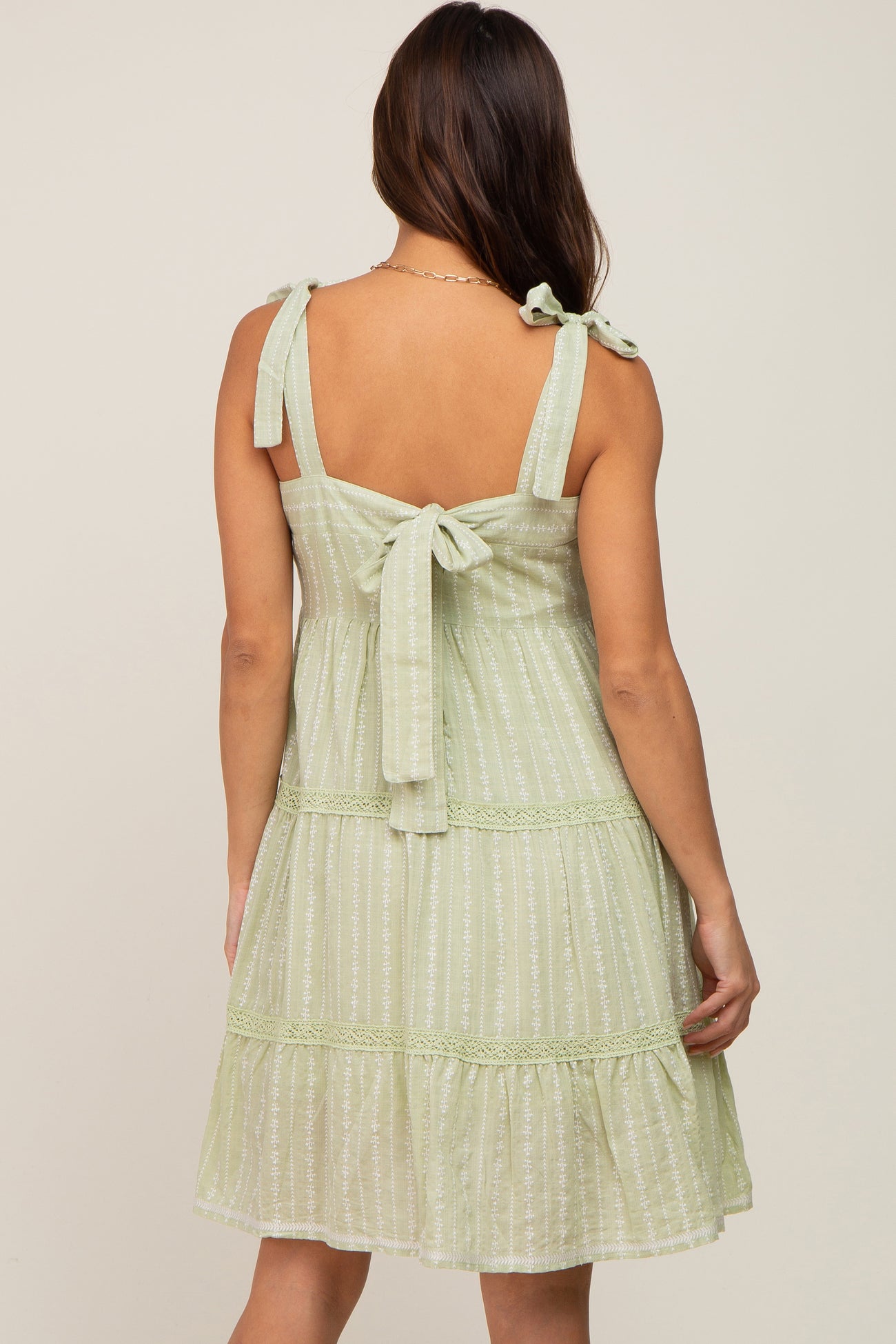 A sleeveless printed maternity dress featuring a tiered body, self-tie shoulder straps, a self-tie back, a back zipper and a square neckline.