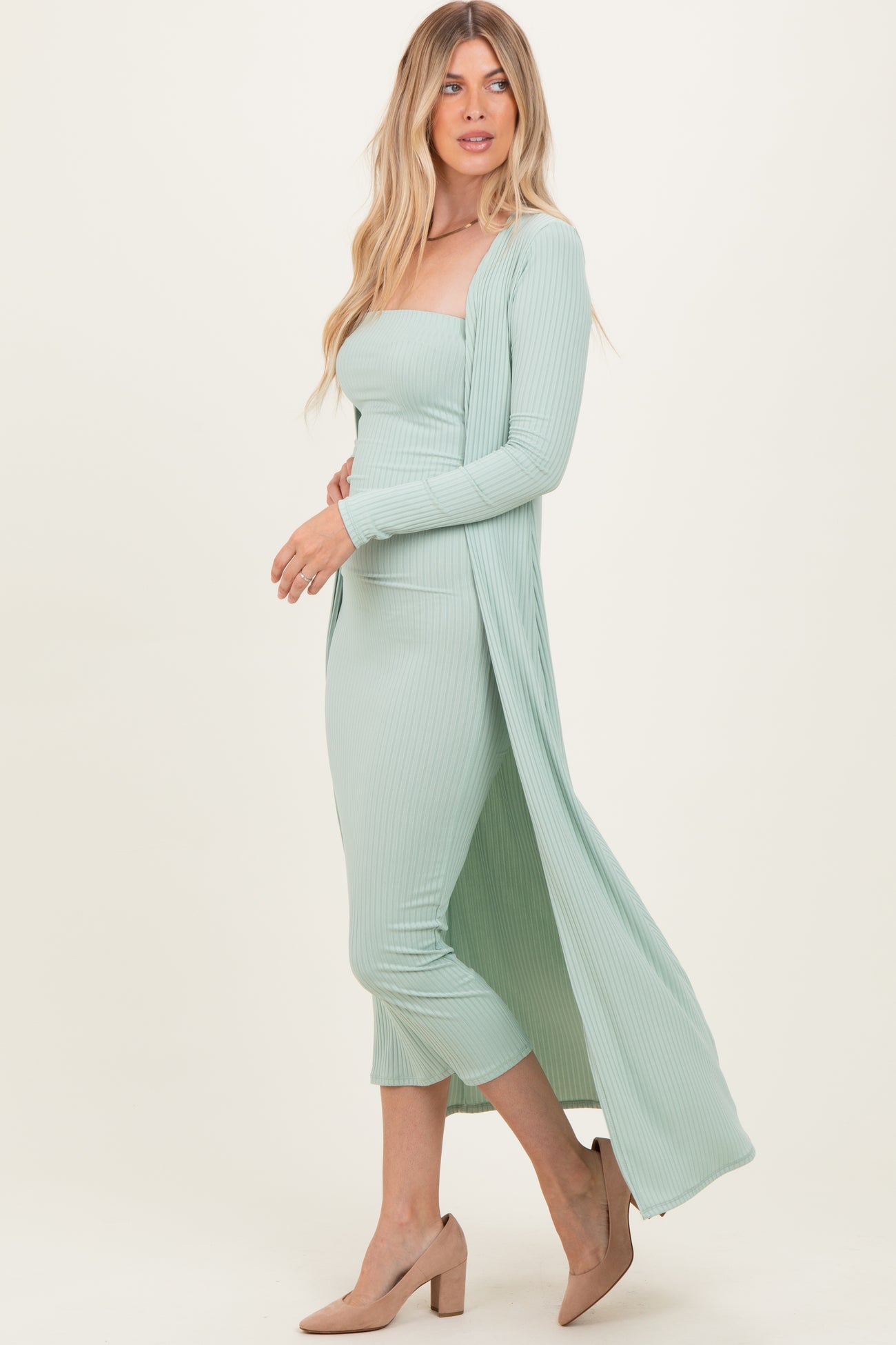 Sage Ribbed Sleeveless Dress Cardigan Set
