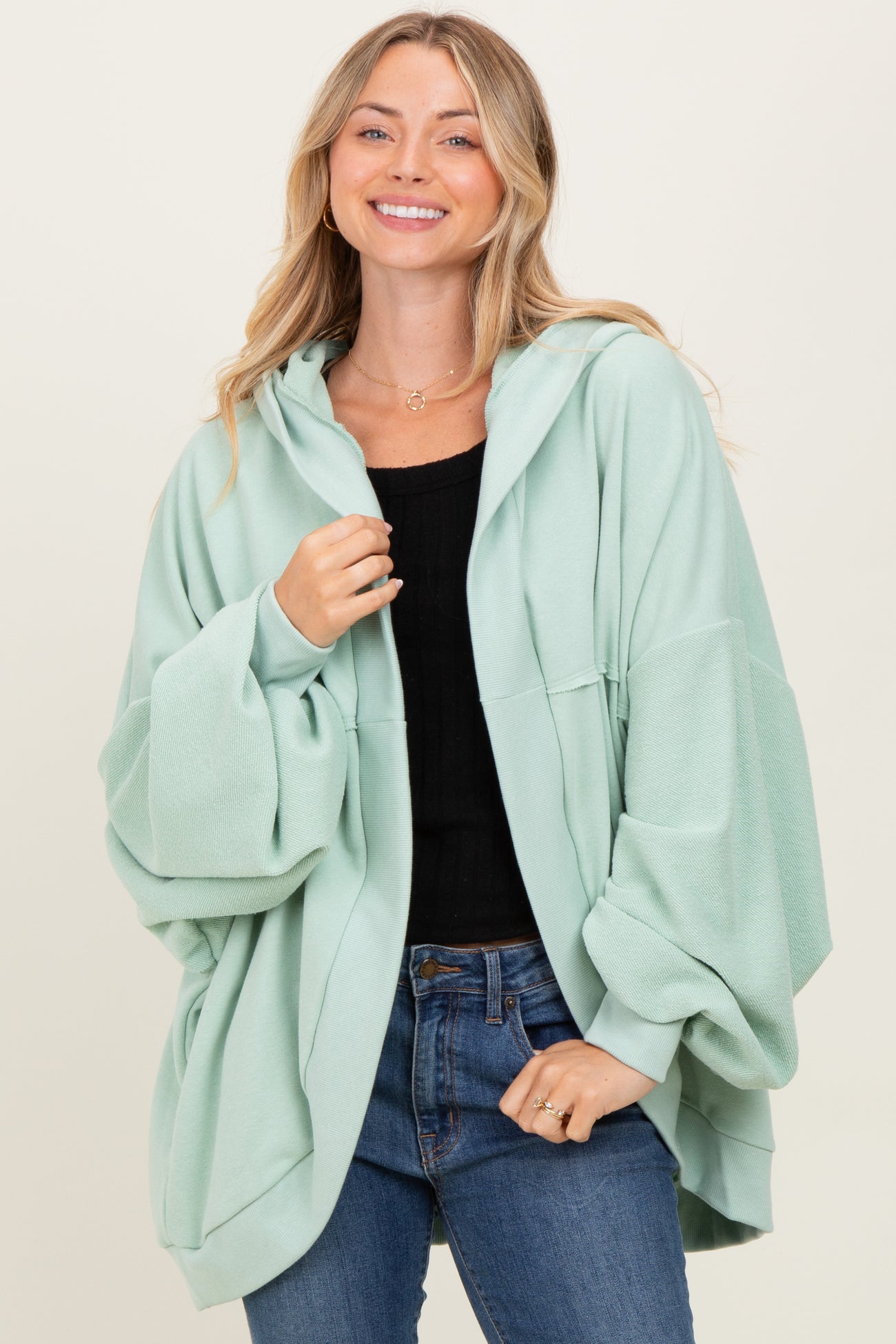 Sage Solid Terry Long Dolam Sleeve Vintage Hoodie