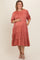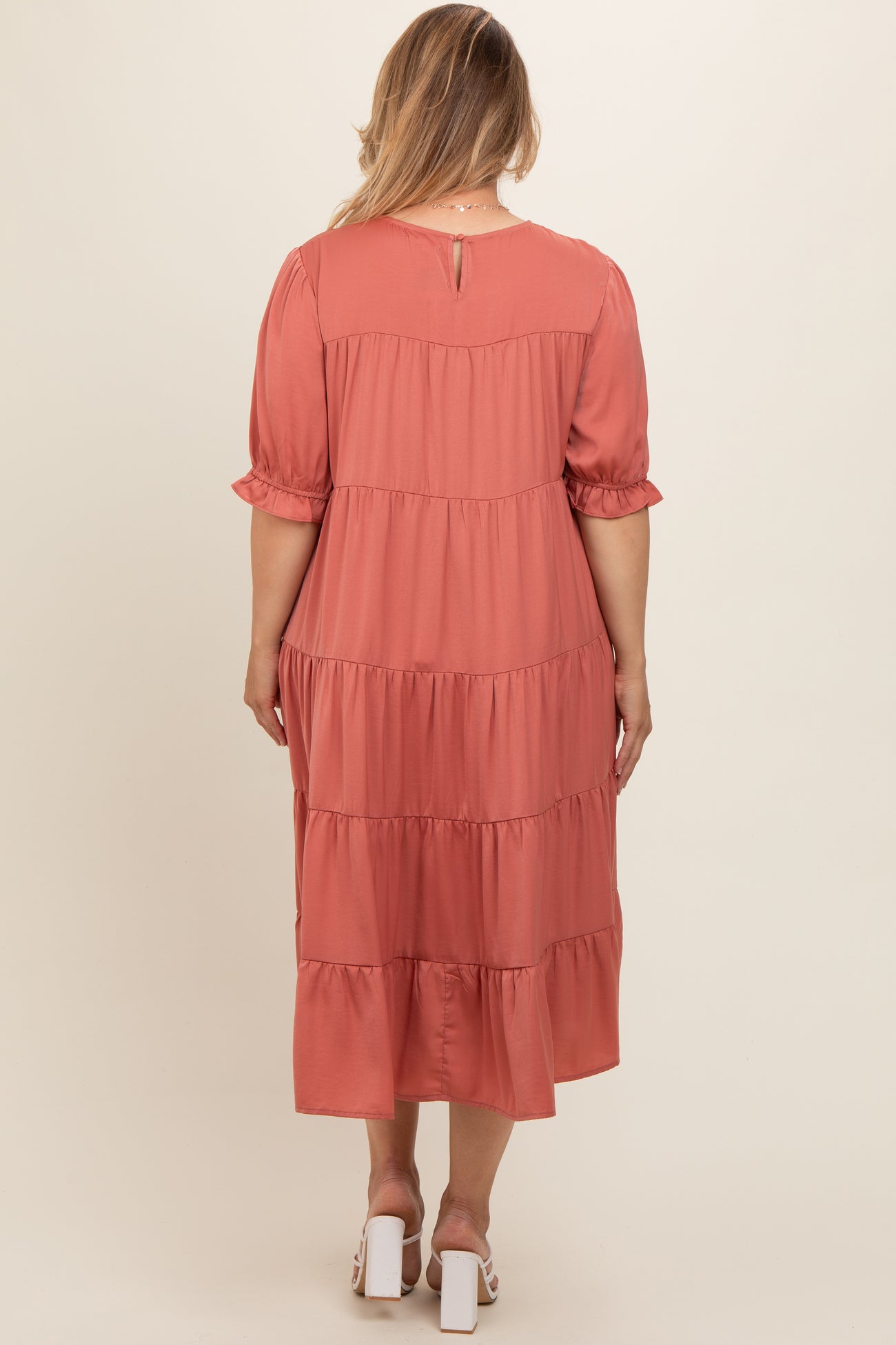 A solid hue maternity plus size dress featuring a round neckline, short cinched sleeves, a tiered body, a back keyhole button closure, and side pockets.