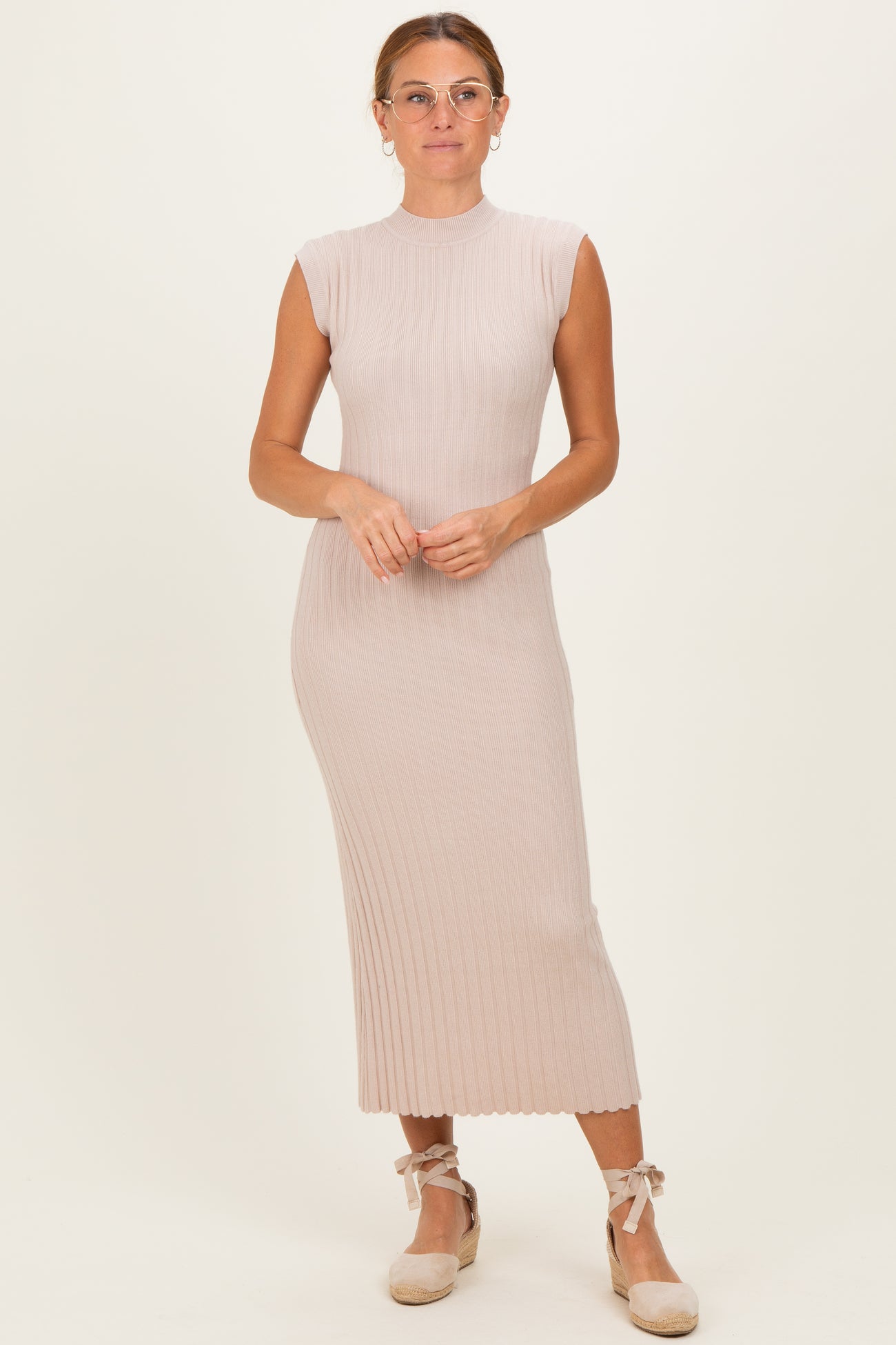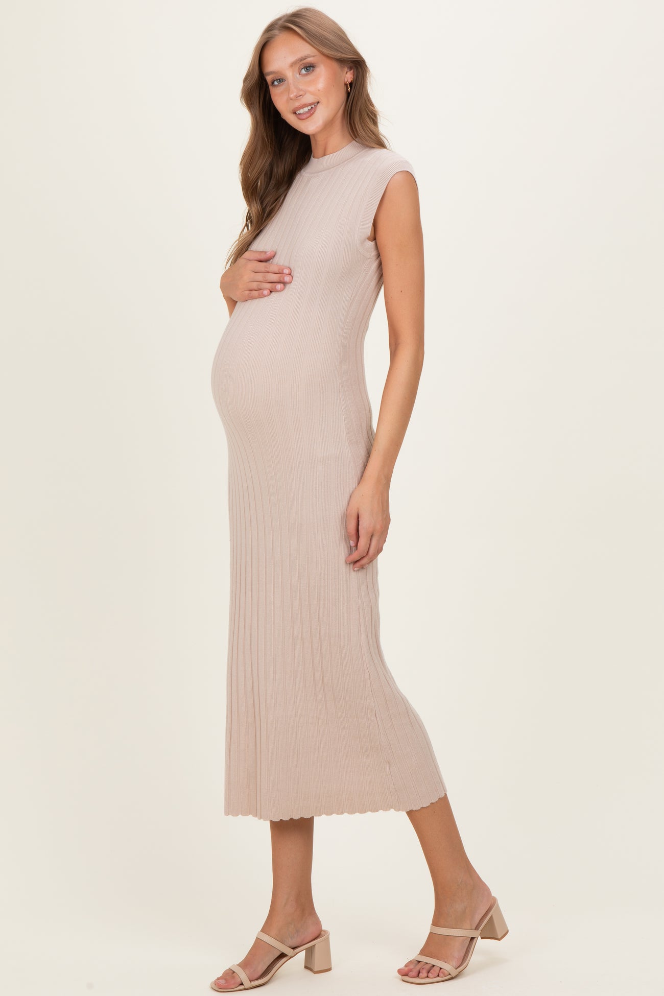 Sand Ribbed Knit Mock Neck Maternity Maxi Dress