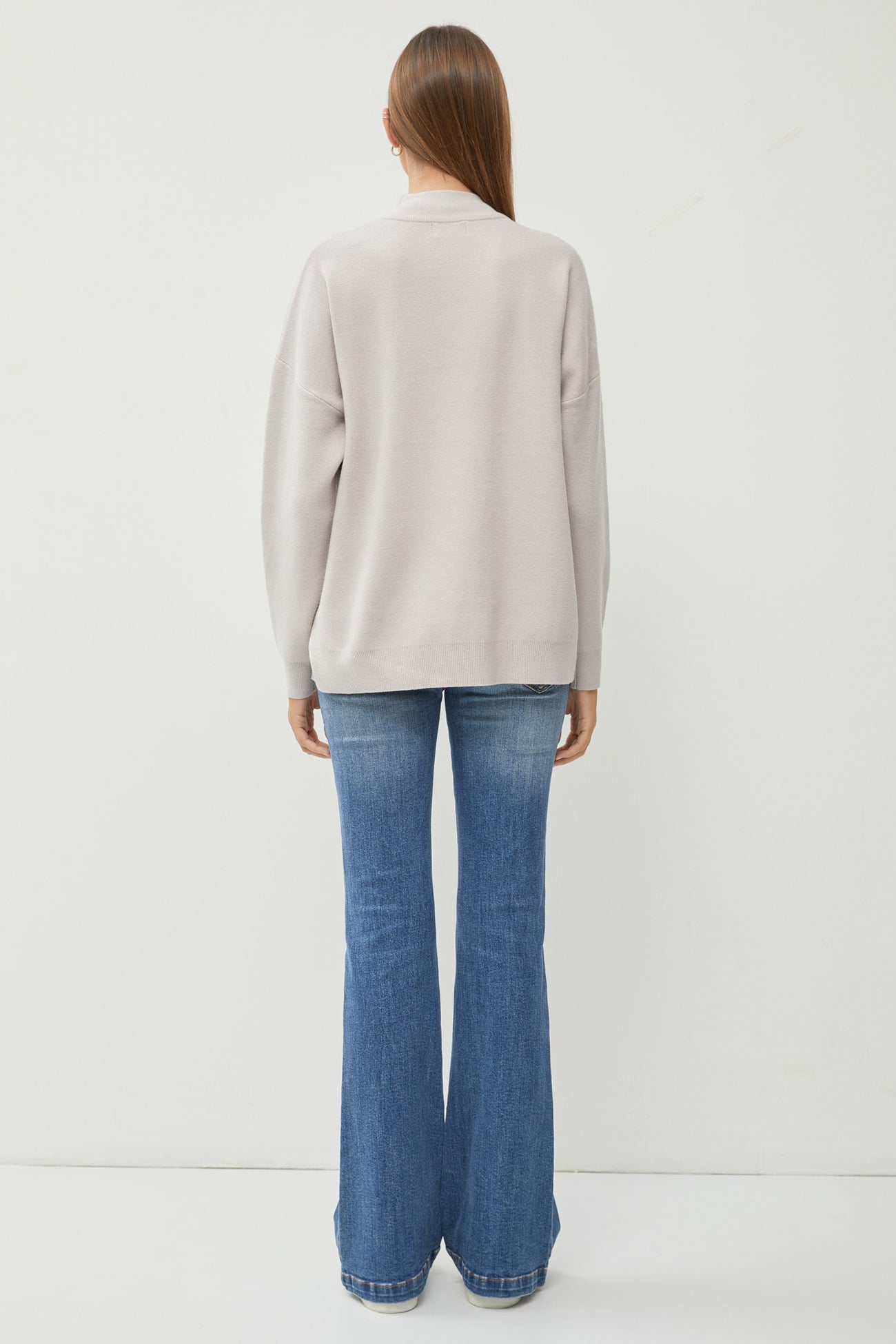 An ultra soft knit sweater featuring a mock neckline, long sleeves and a ribbed trim.