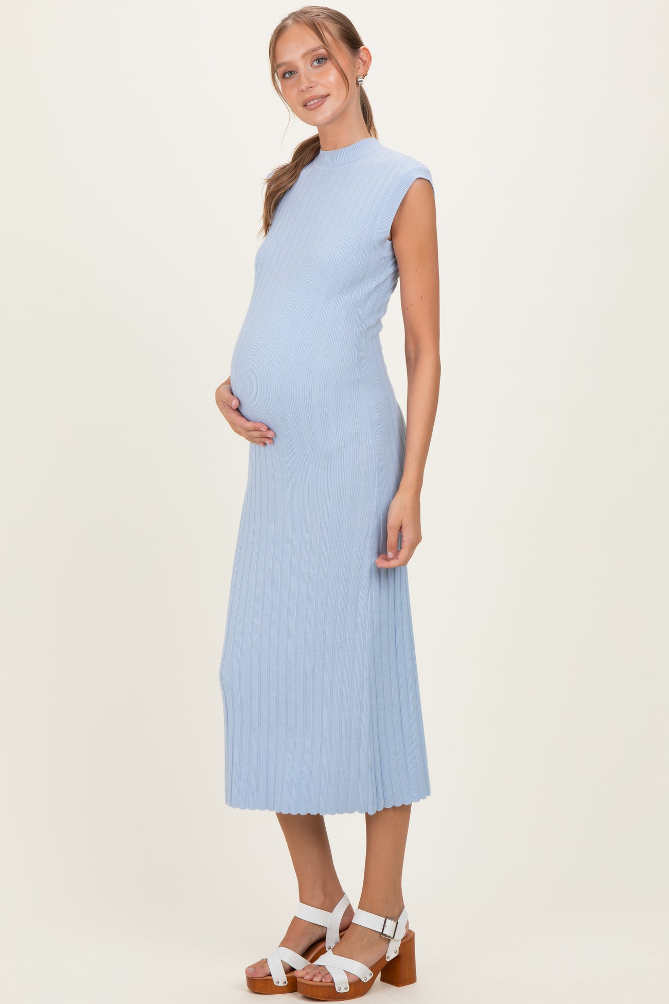 Sky Blue Ribbed Knit Mock Neck Maternity Maxi Dress
