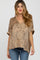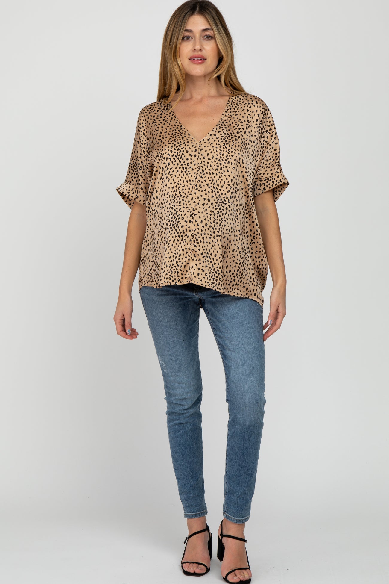 A printed maternity blouse with a v-neckline and cuffed sleeves in a silky material.