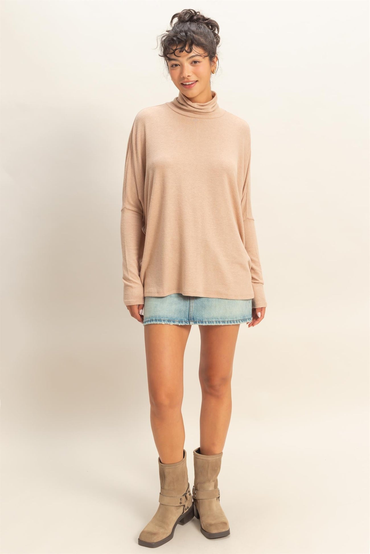 Taupe Draped Oversized Turtleneck Dolman Sleeve Top