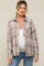 A soft flannel plaid maternity top featuring a collared neckline, a button front, a front pocket, long sleeves and side slits.