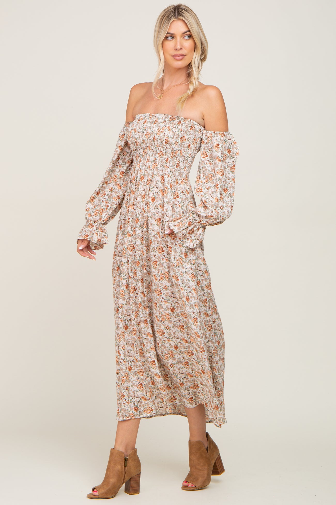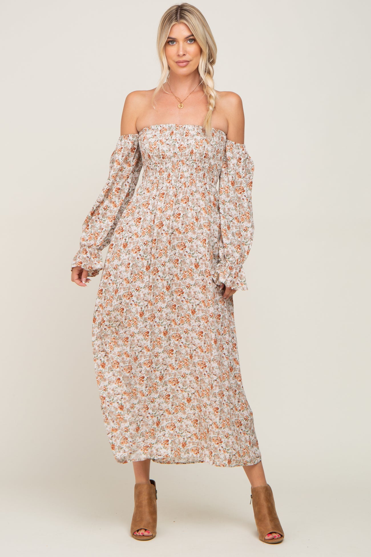 A floral maxi dress featuring a smocked bodice, long sleeves, and off the shoulder neckline, and side pockets.
