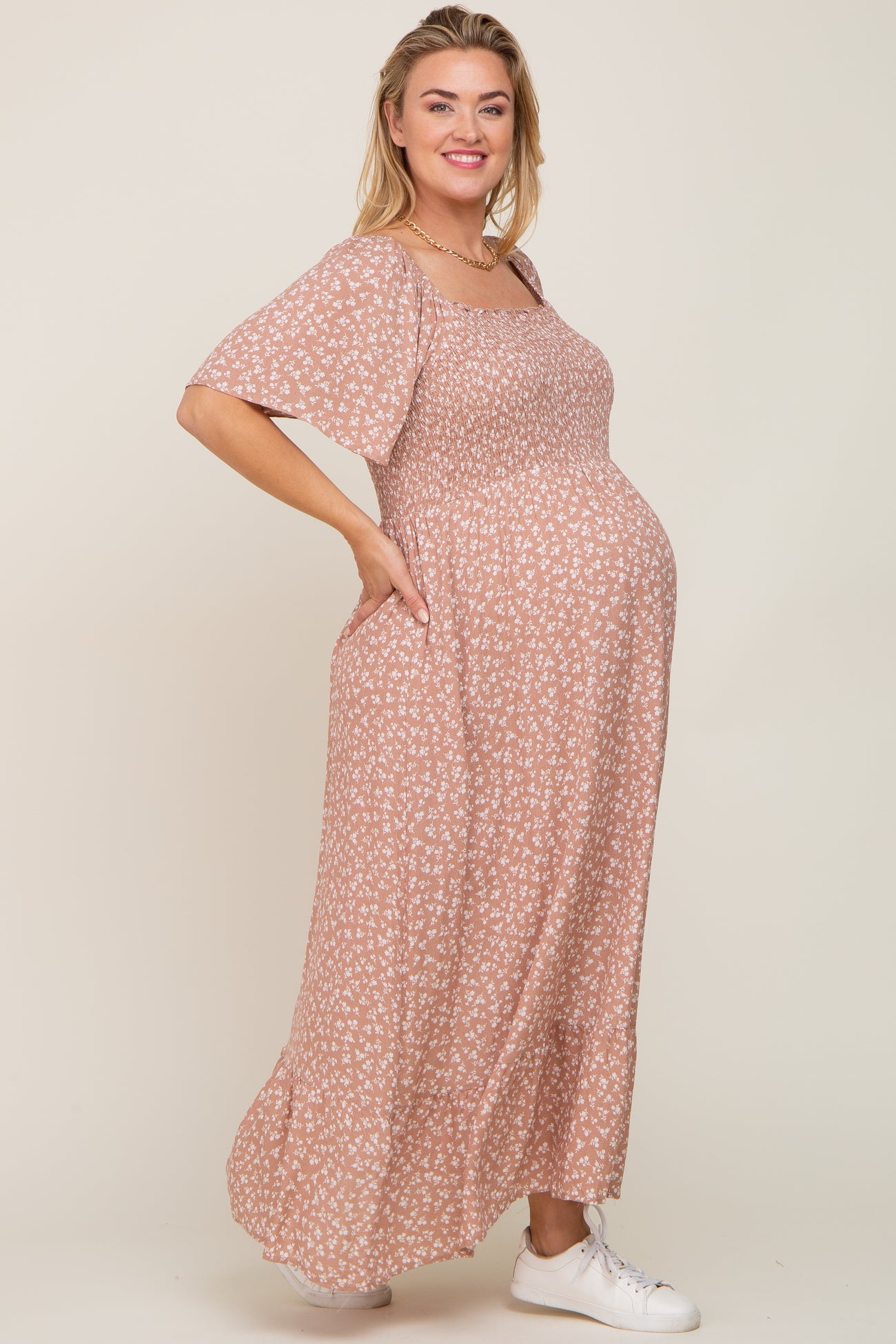 Taupe Floral Smocked Flounce Sleeve Maternity Plus Maxi Dress