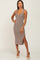 A solid knit fitted sleeveless midi dress with a square neckline and a side slit.