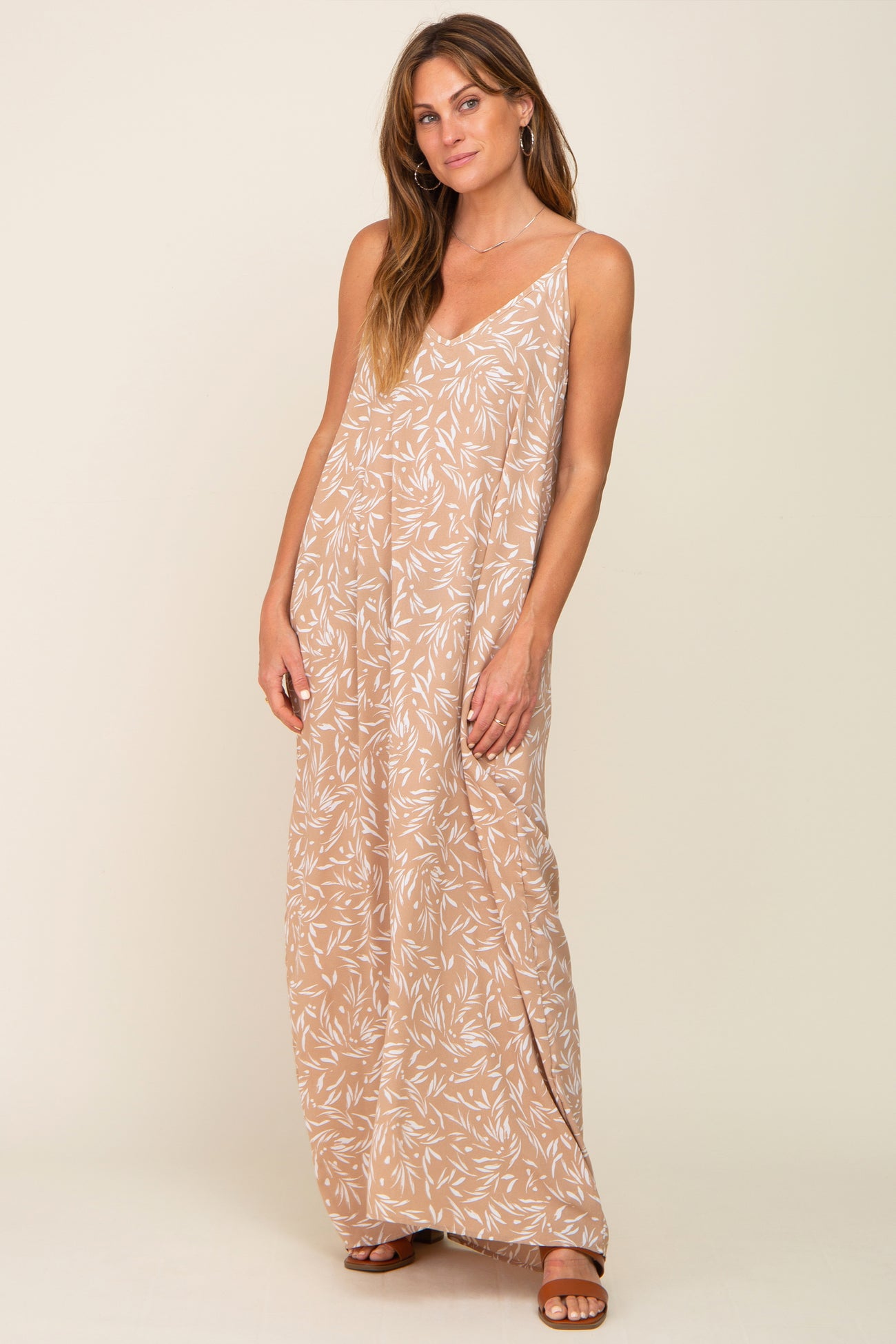 Taupe Leaf Print Double V-Neck Maternity Maxi Dress