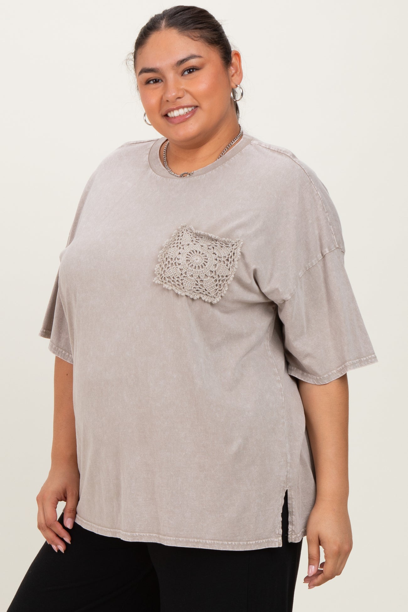 Taupe Mineral Wash Crochet Pocket Plus Top