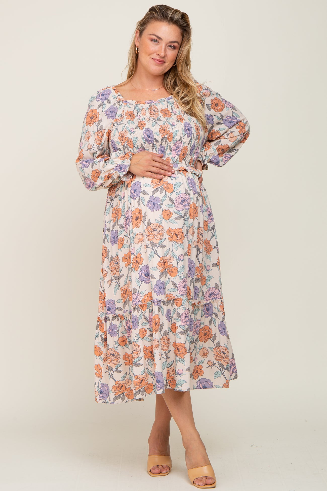 A multi-color floral plus maternity midi dress featuring long sleeves, a smocked top, ruffle accents, a ruffle hem and side pockets.
