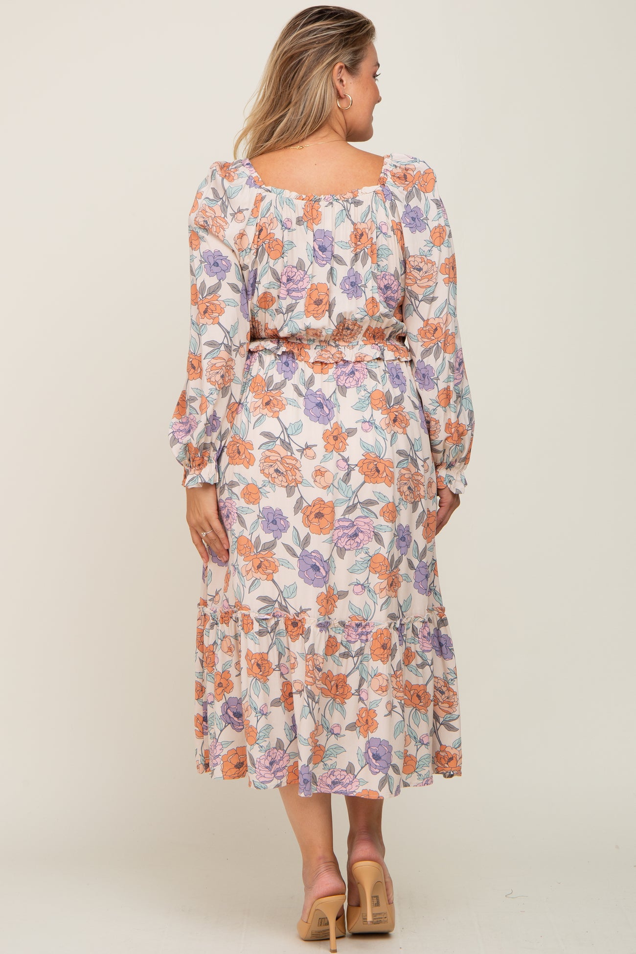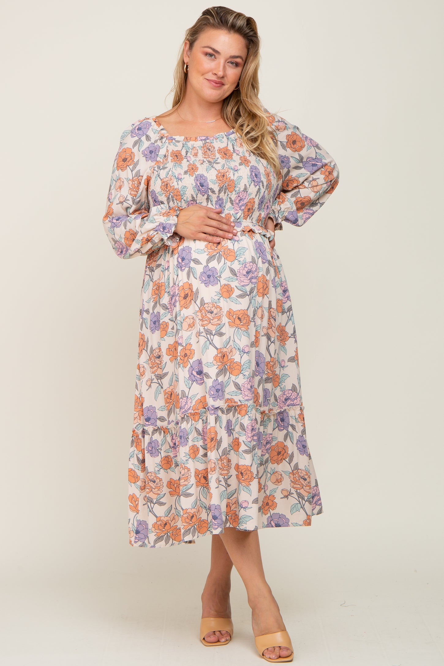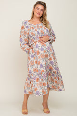 Taupe Multi-Color Floral Plus Maternity Midi Dress