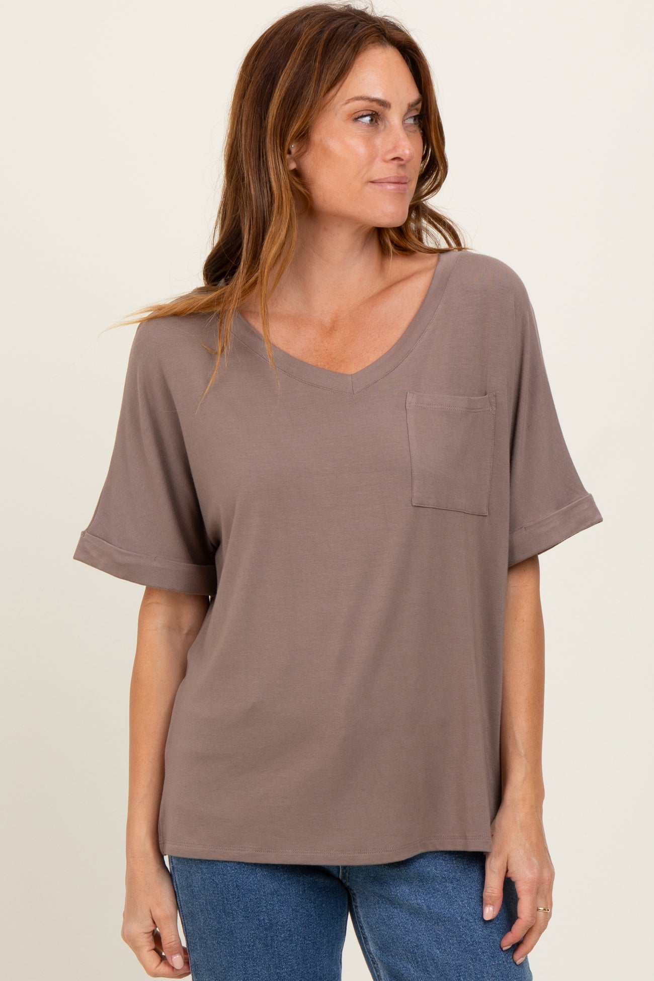 Taupe Oversized V-Neck Front Pocket T-Shirt
