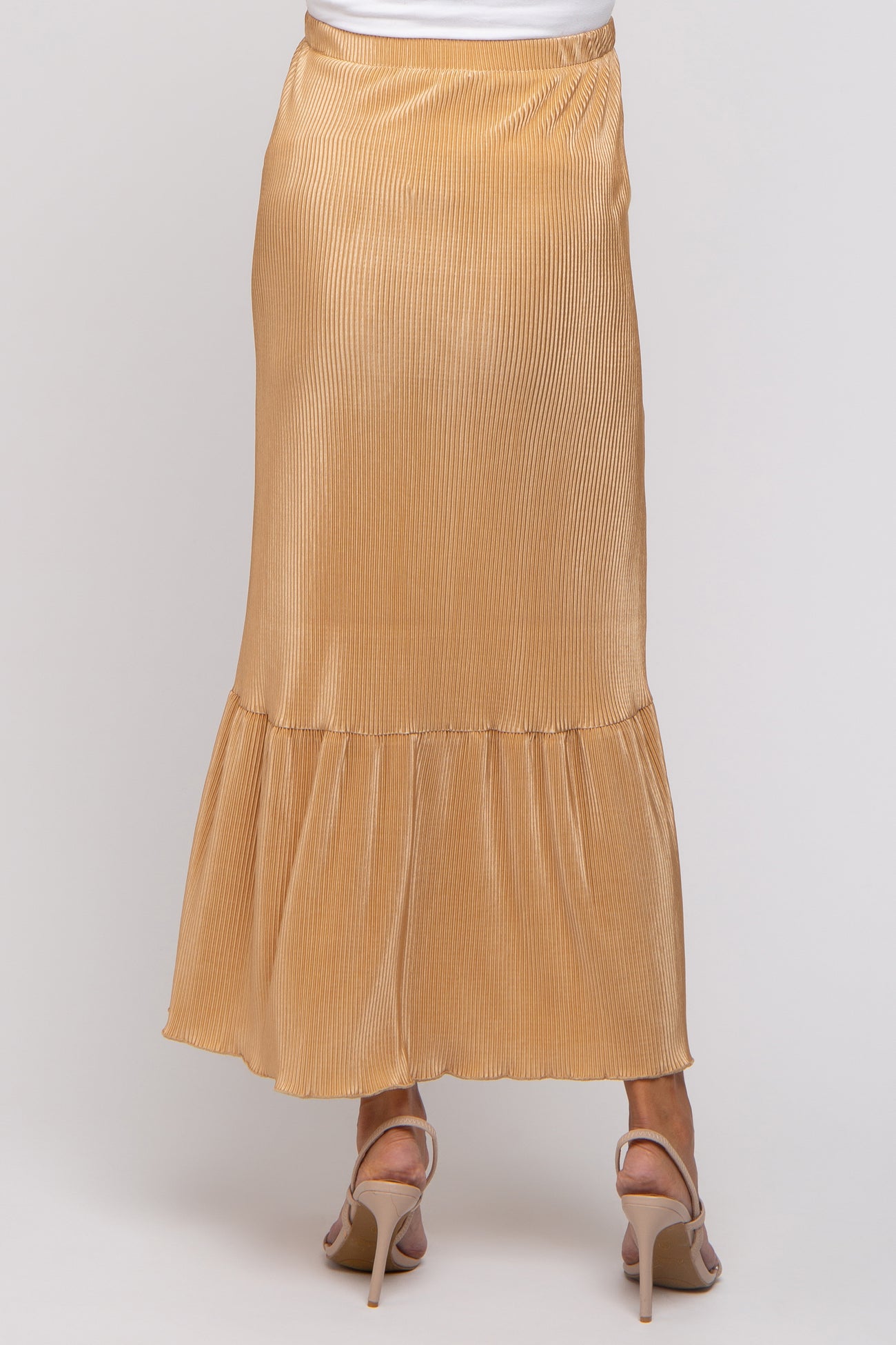 A solid pleated maternity maxi skirt with an elastic waistband and ruffle hem.