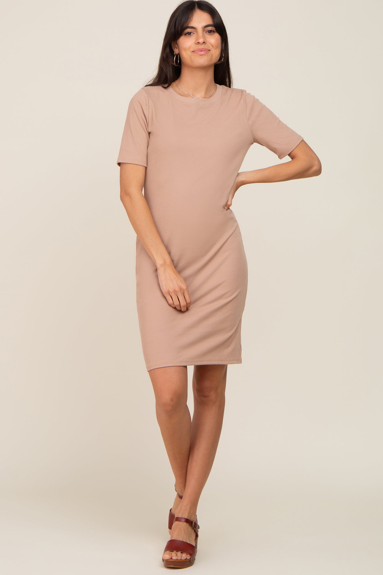 Taupe Ribbed Basic Short Sleeve Dress