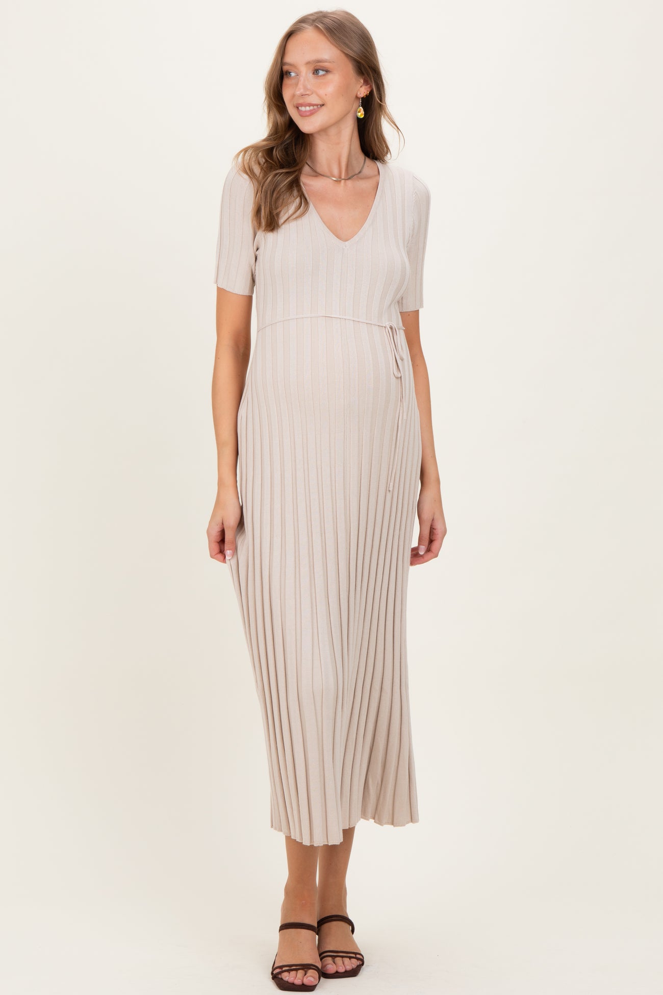 Taupe Ribbed Short Sleeve Maternity Knit Maxi Dress