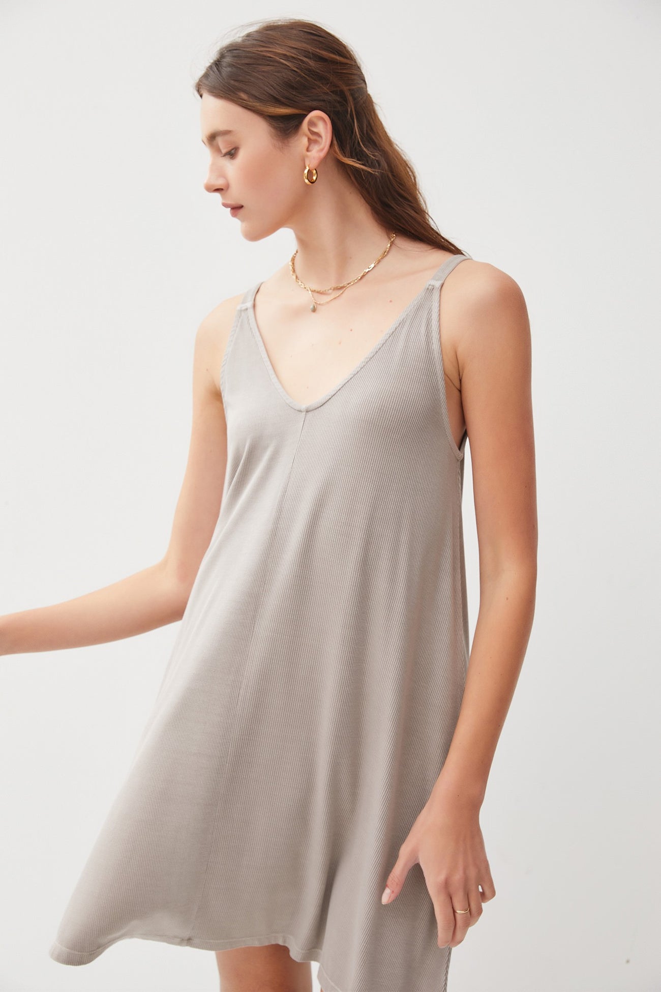 A sleeveless ribbed maternity dress featuring a front seam and a v-neckline.