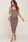 A soft knit maternity midi dress featuring ruching on the sides and back, a scoop neckline and a v-back.