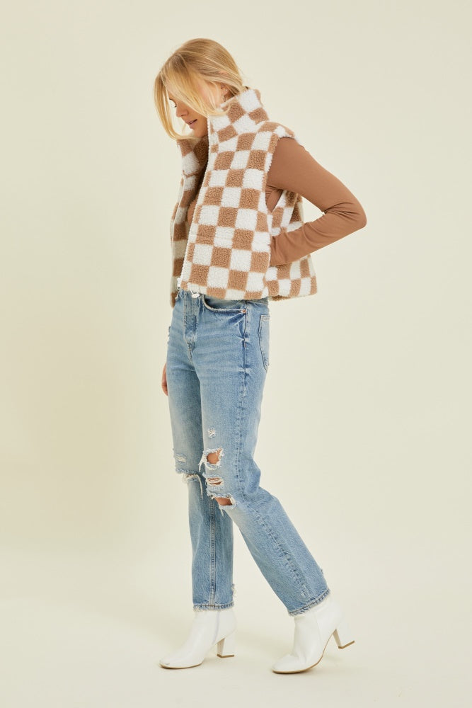 Taupe Sherpa Print Zip Up Vest