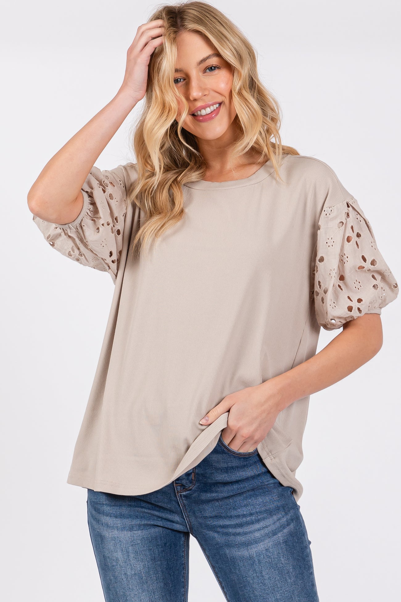 Taupe Short Puff Eyelet Lace Floral Sleeve Top