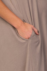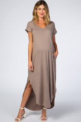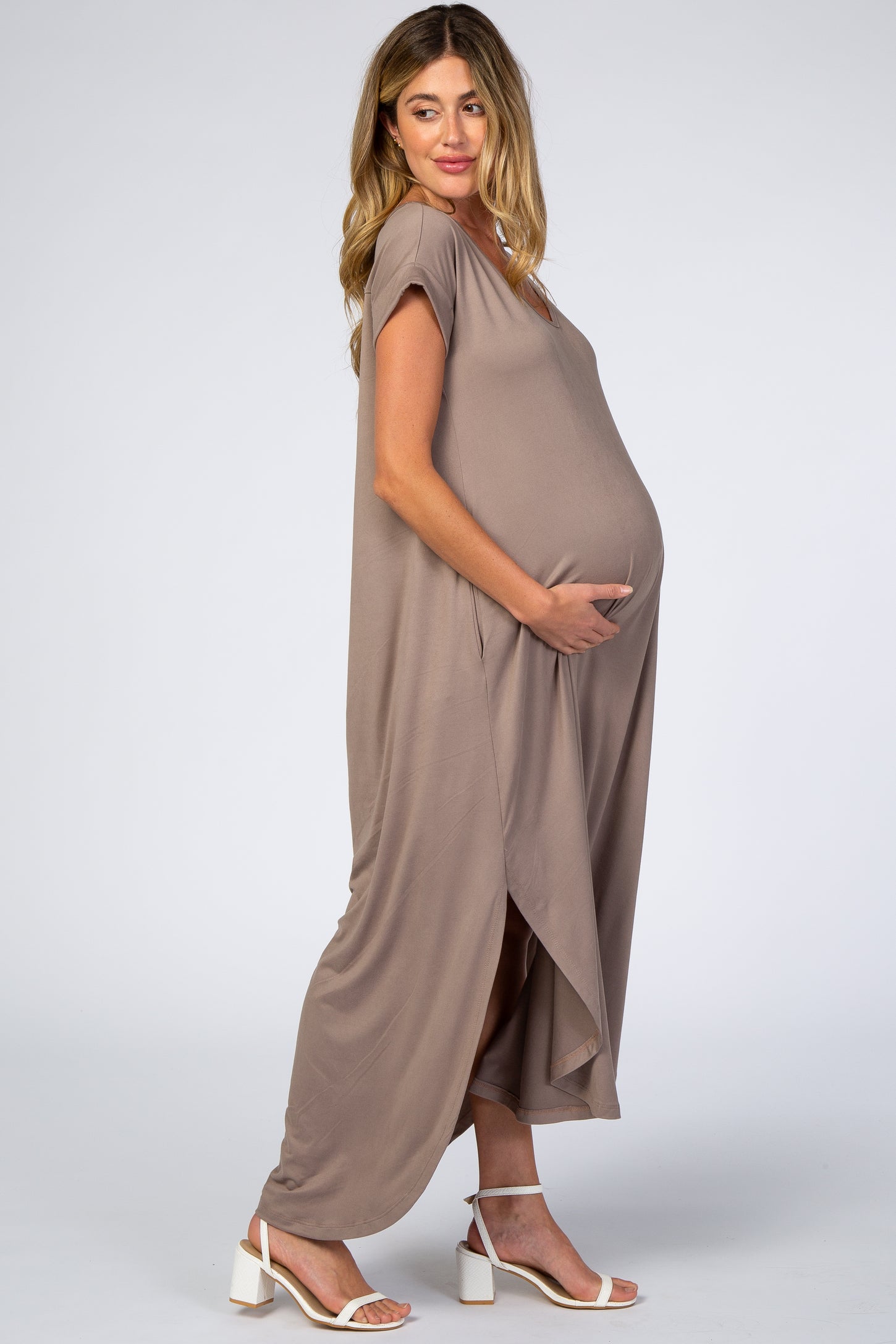 A solid hued maternity dress featuring short sleeves, a round neckline, side pockets, a curved hem and large side slits.