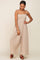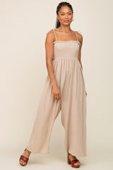 A cropped sleeveless jumpsuit featuring self-tie shoulder straps, a smocked top and a square neckline.
