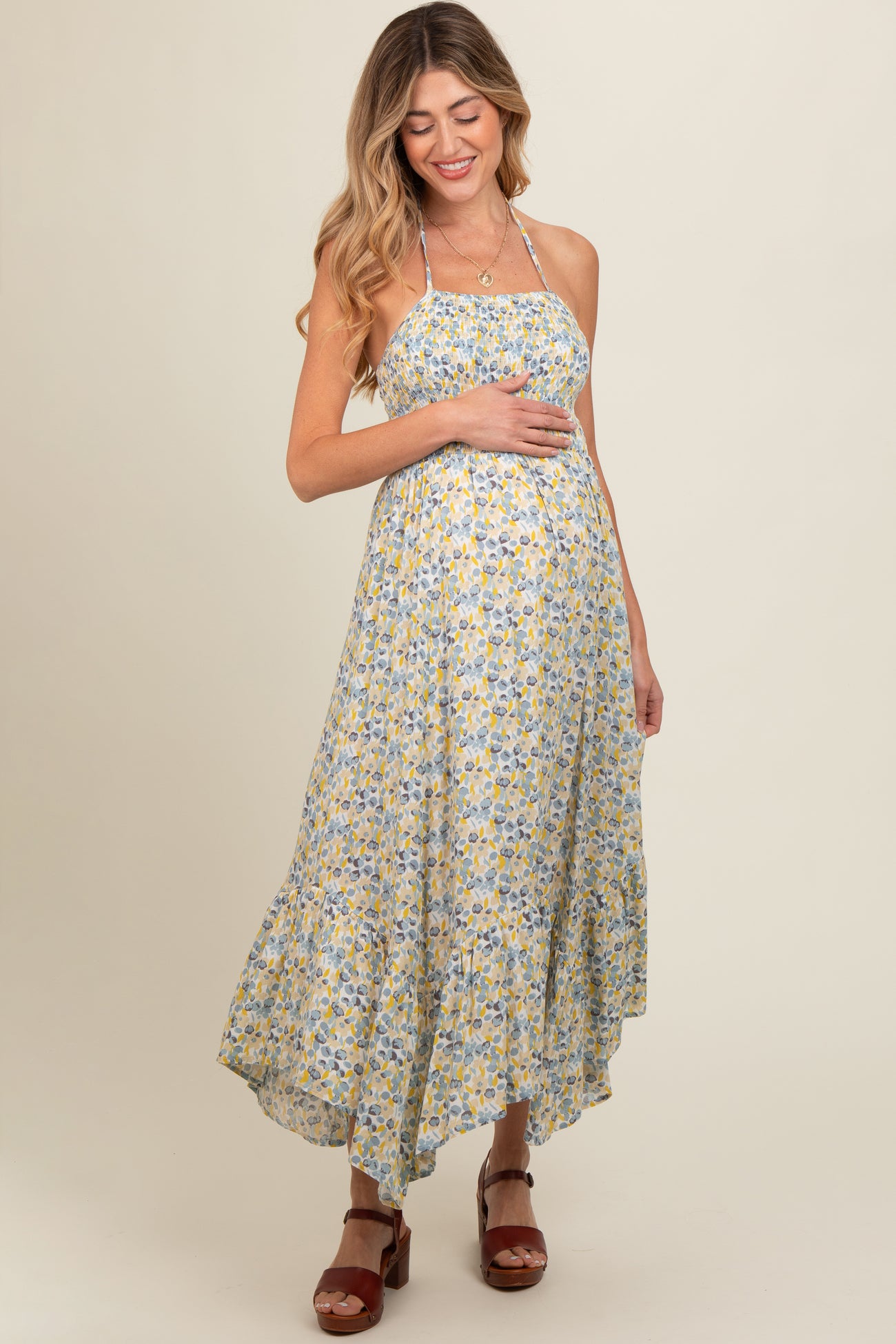Teal Floral Smocked Halter Flowy Maternity Maxi Dress