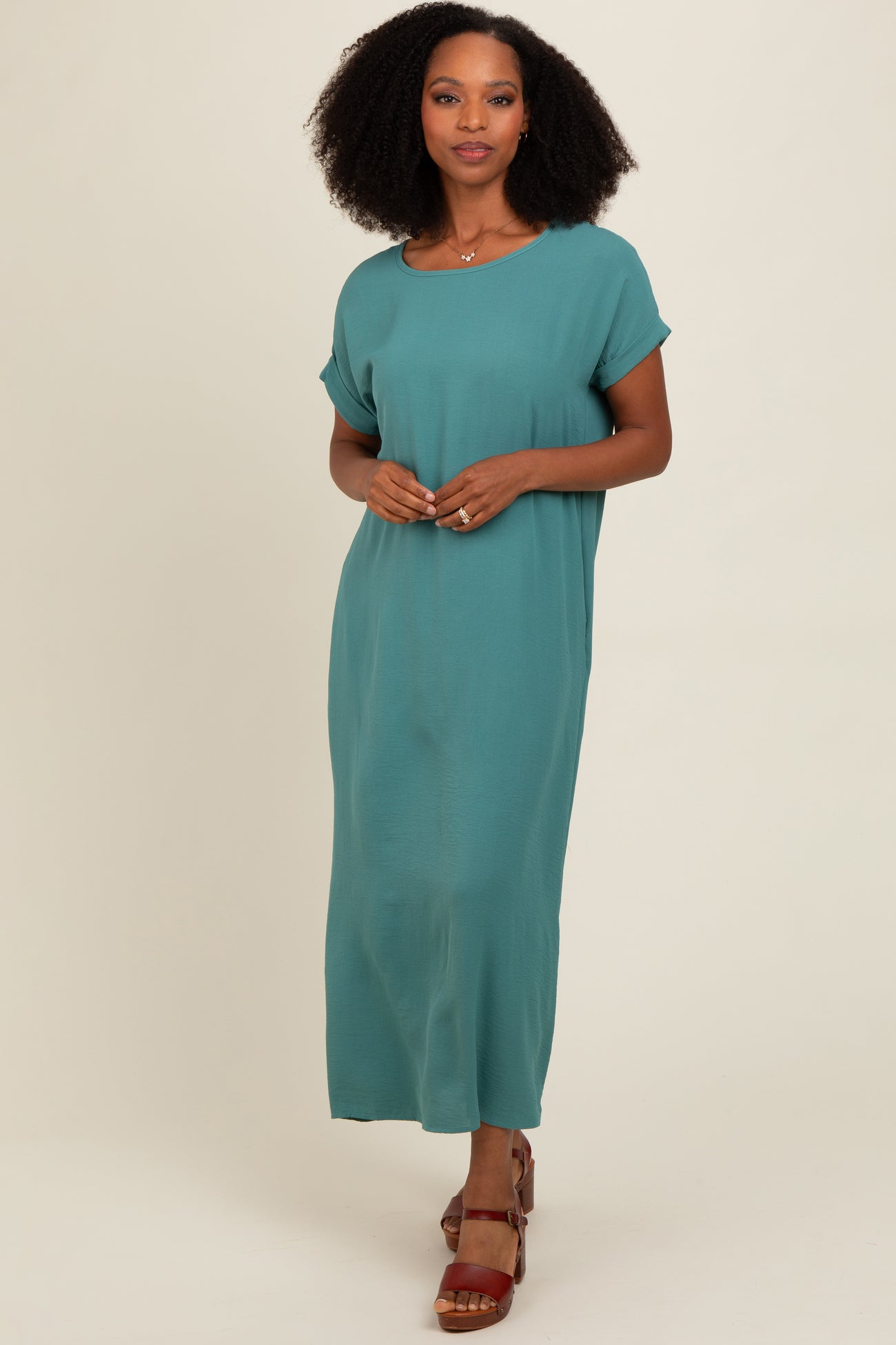 Teal Rolled Cuff Midi Dress
