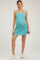 A soft knit maternity tennis romper dress. Features a scoop neckline, a racerback with a cutout, removable cups, an elastic band under the bust, and side pockets on the shorts.