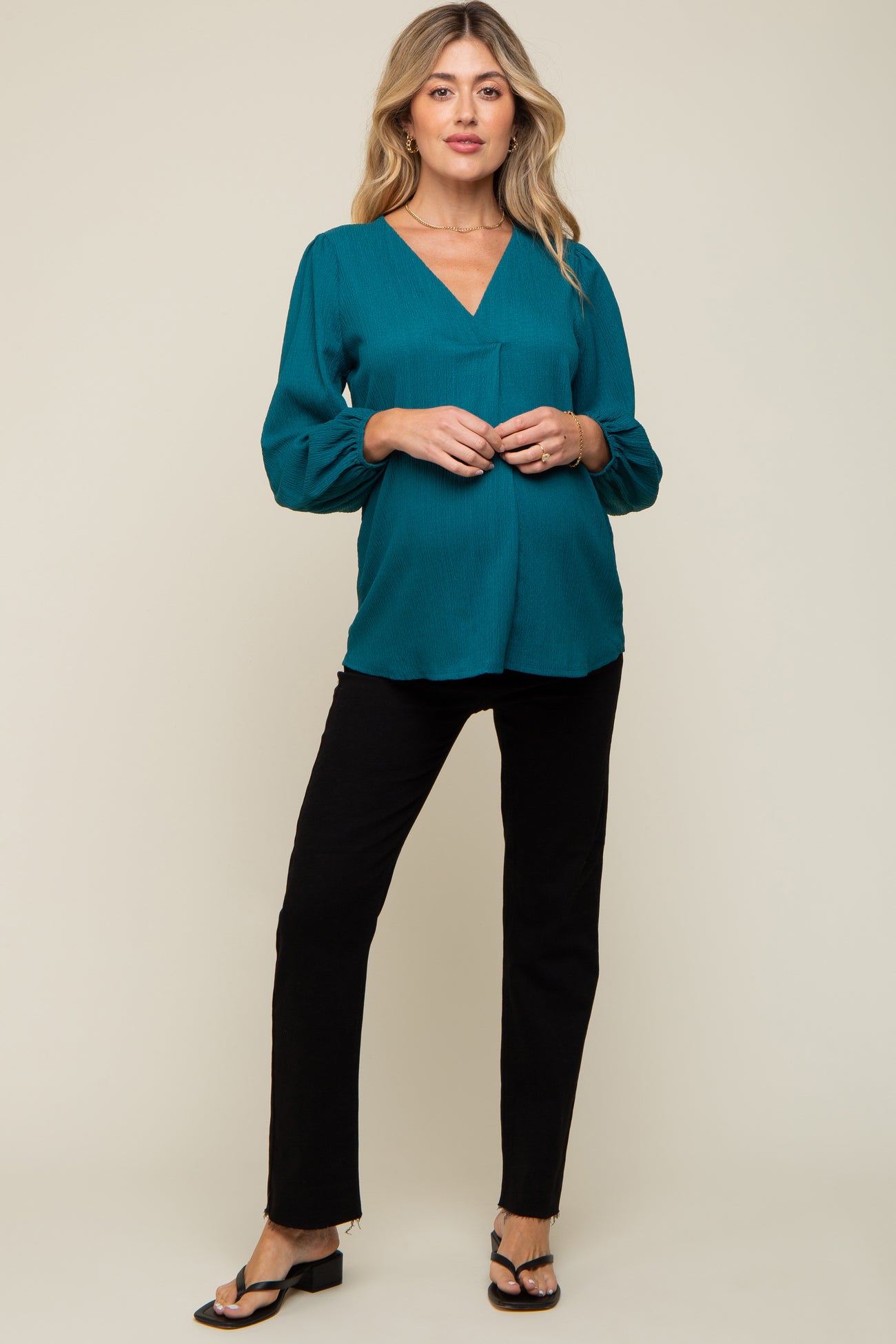 Details A solid textured maternity blouse featuring long sleeves and a v-neckline. Content + Care
