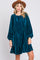 A velvet dress featuring a rounded neckline, long puff sleeves, a tiered A-line skirt and a keyhole back with a button closure.