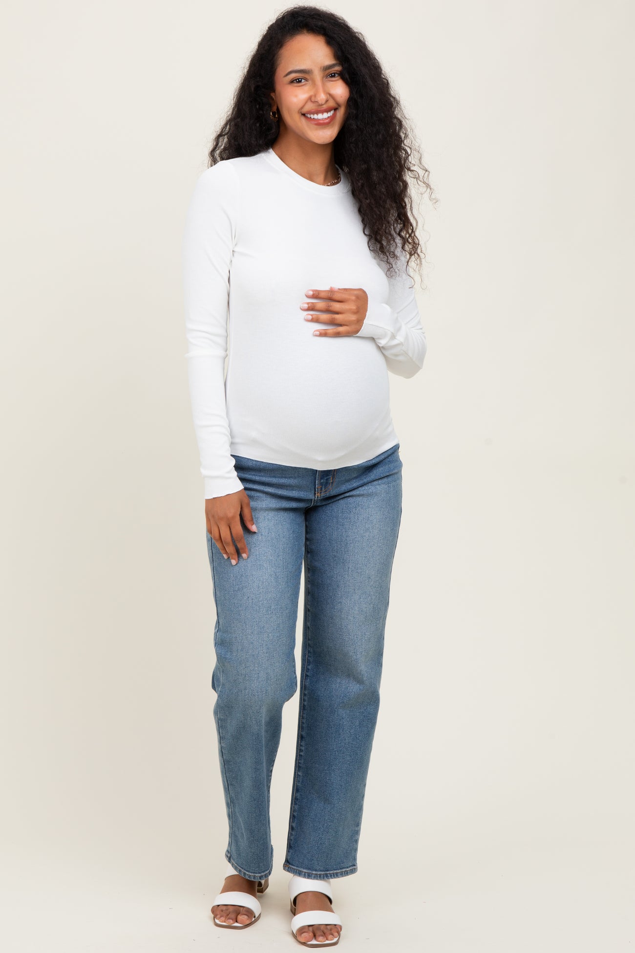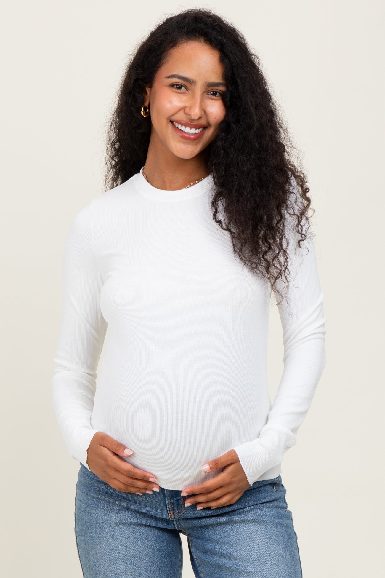 White Basic Ribbed Knit Long Sleeve Maternity Top