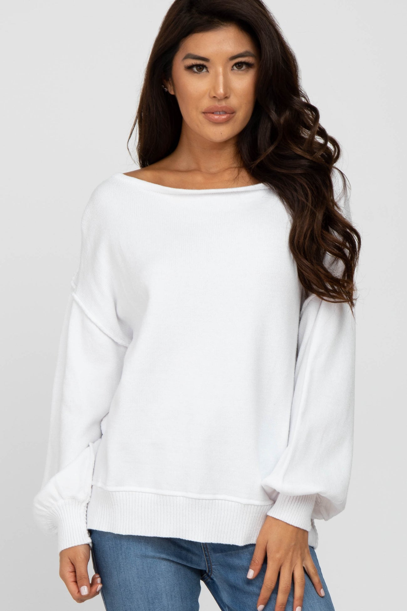 An ultra soft knit sweater featuring a boat neckline, long bubble sleeves, and exposed seam detailing.