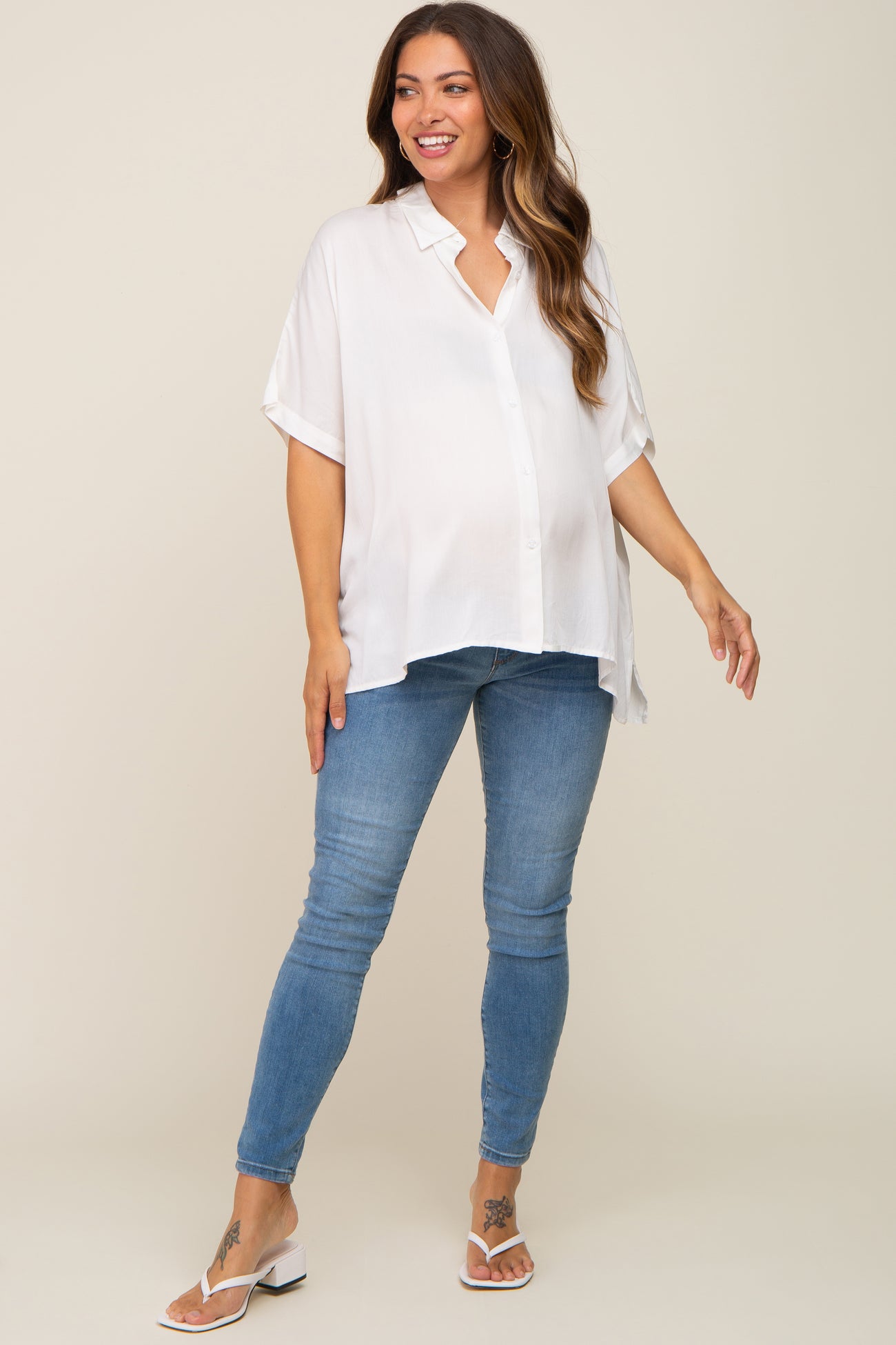 White Button Up Dolman Short Sleeve Maternity Top