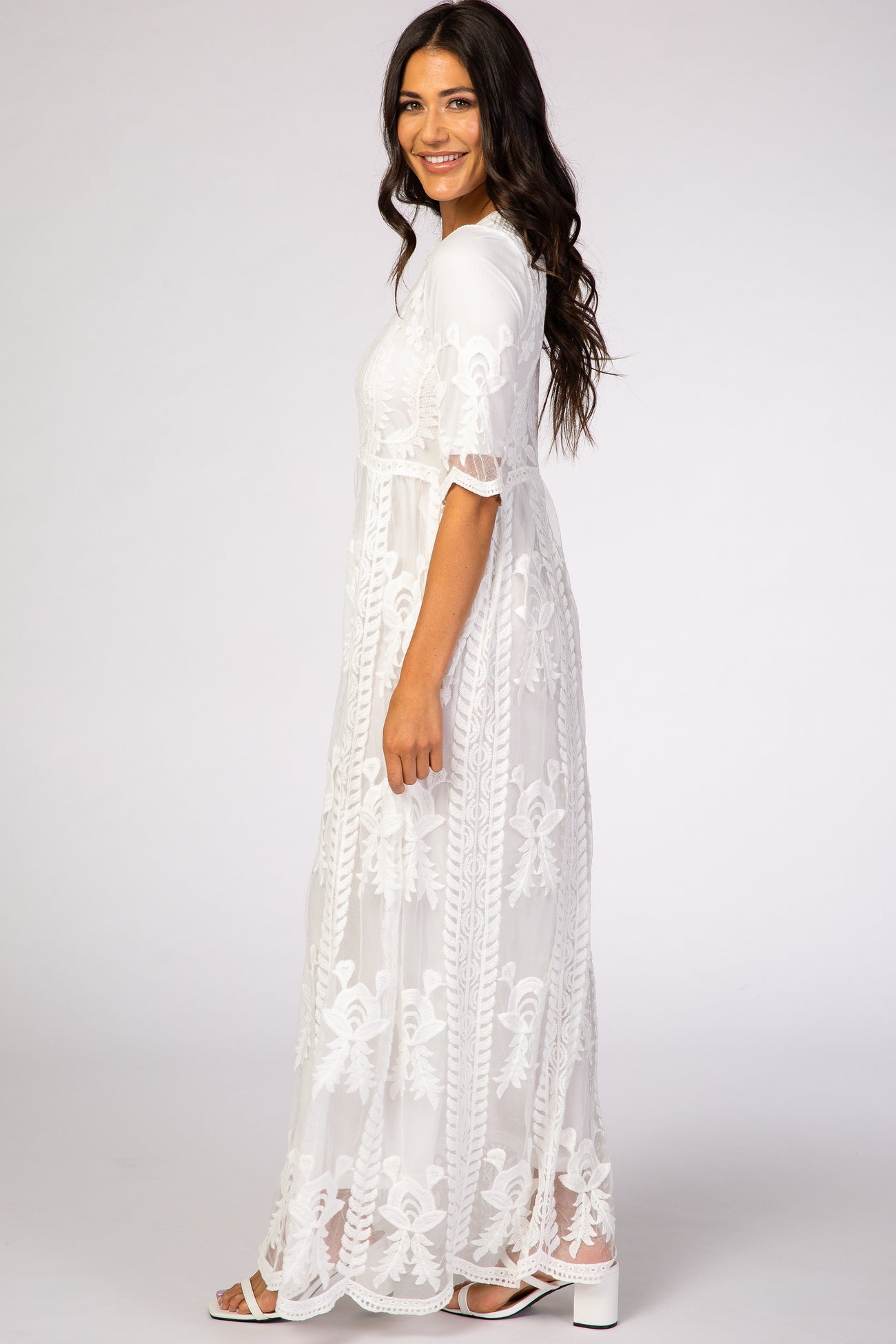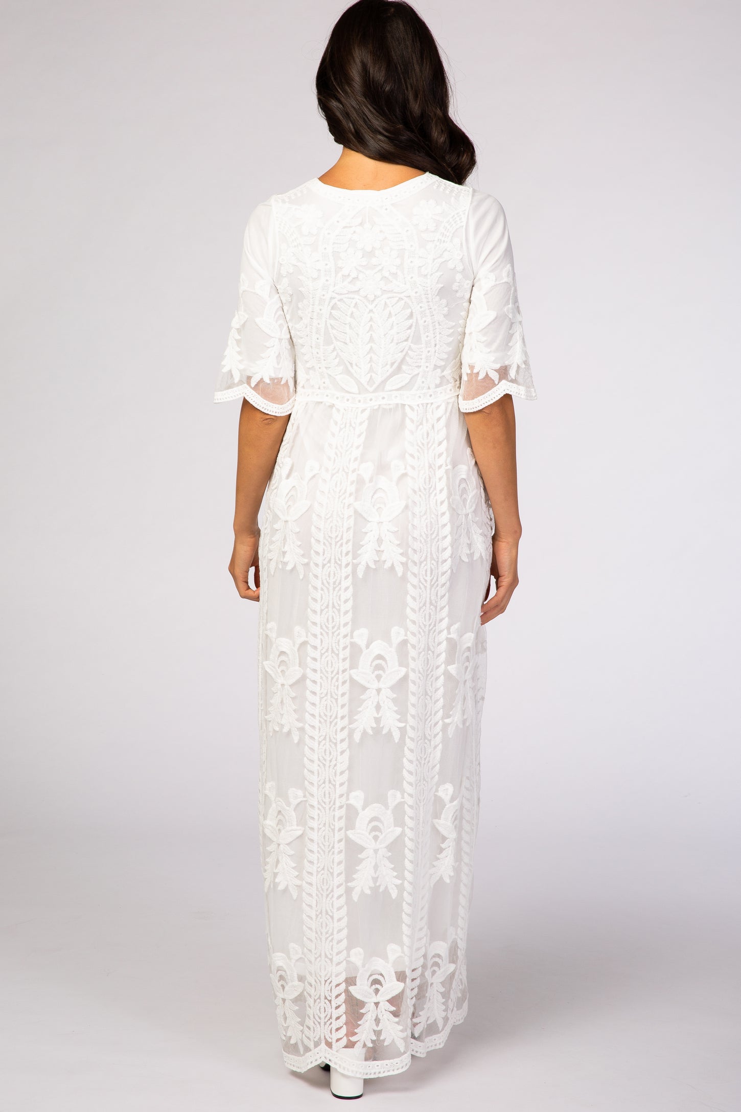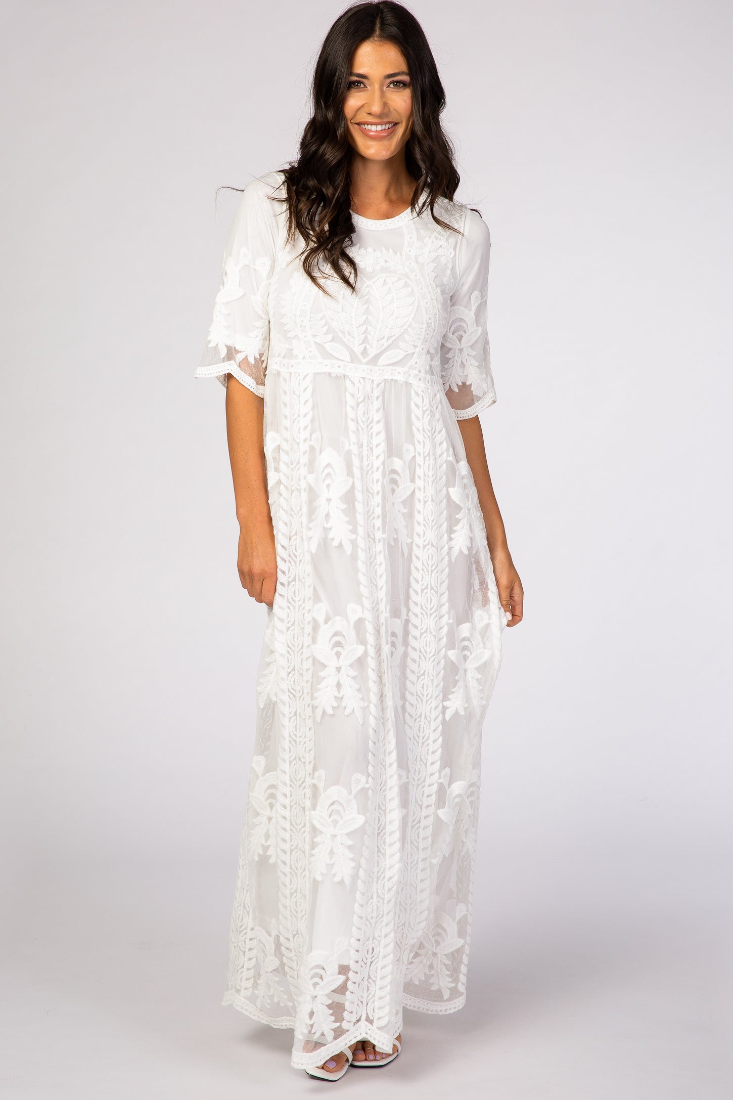 Details A solid hue maxi dress featuring, a rounded neckline, short sleeves, crochet detailing and a double lining. This style runs big. Content + Care