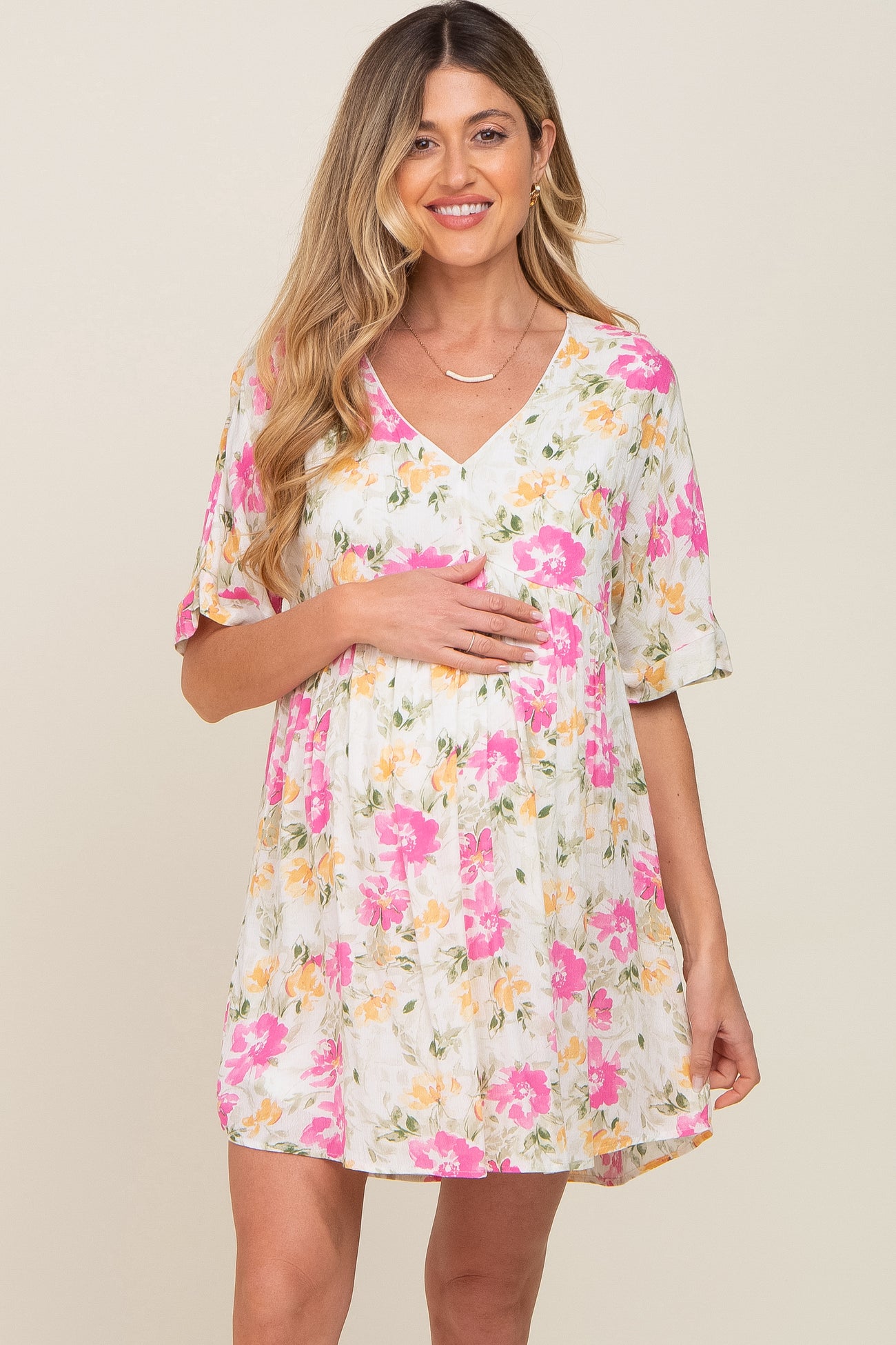 A floral printed babydoll dress with a v-neckline and cuffed sleeves. Double lined.