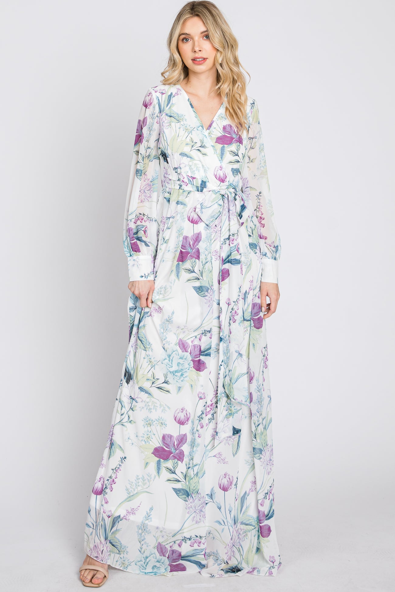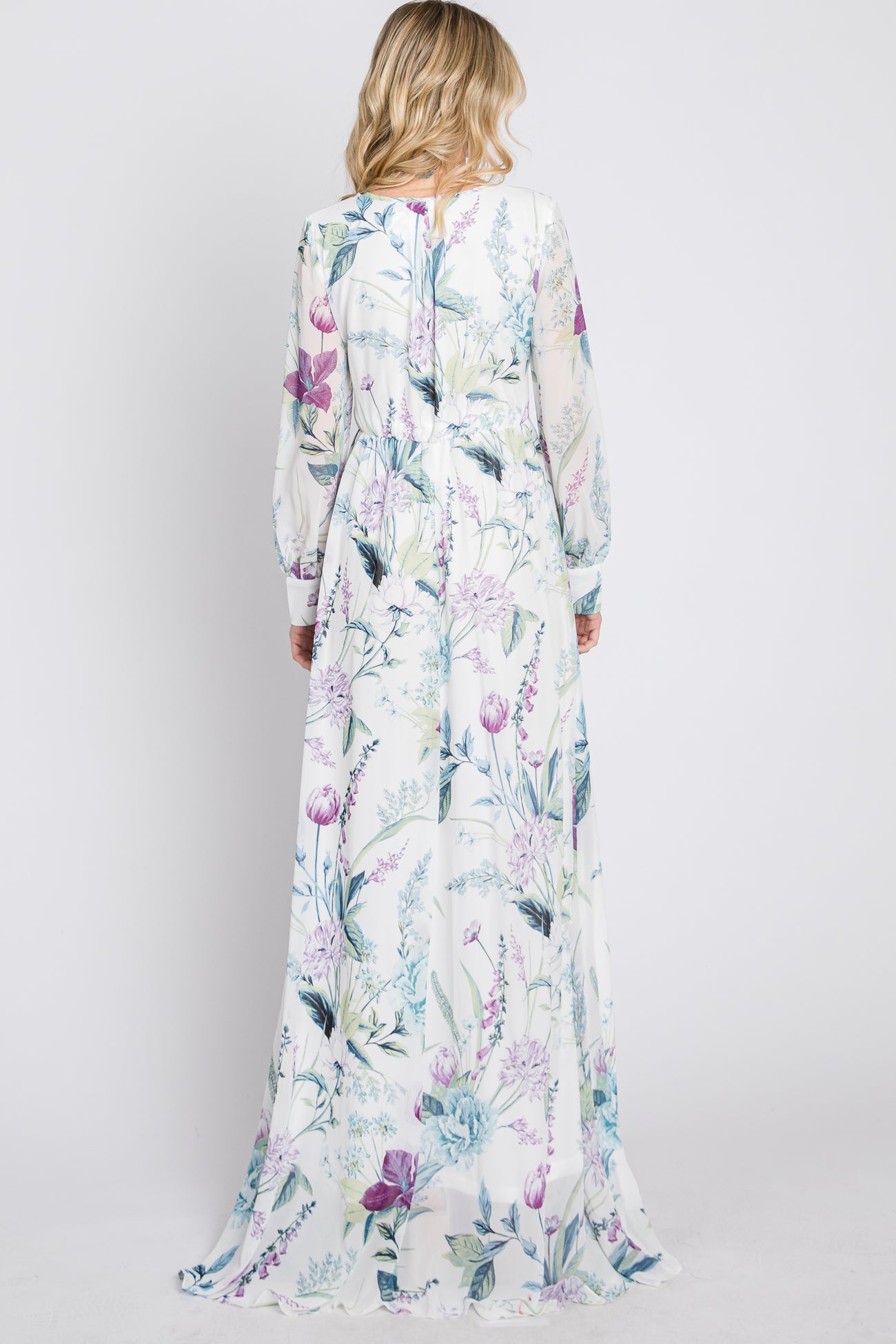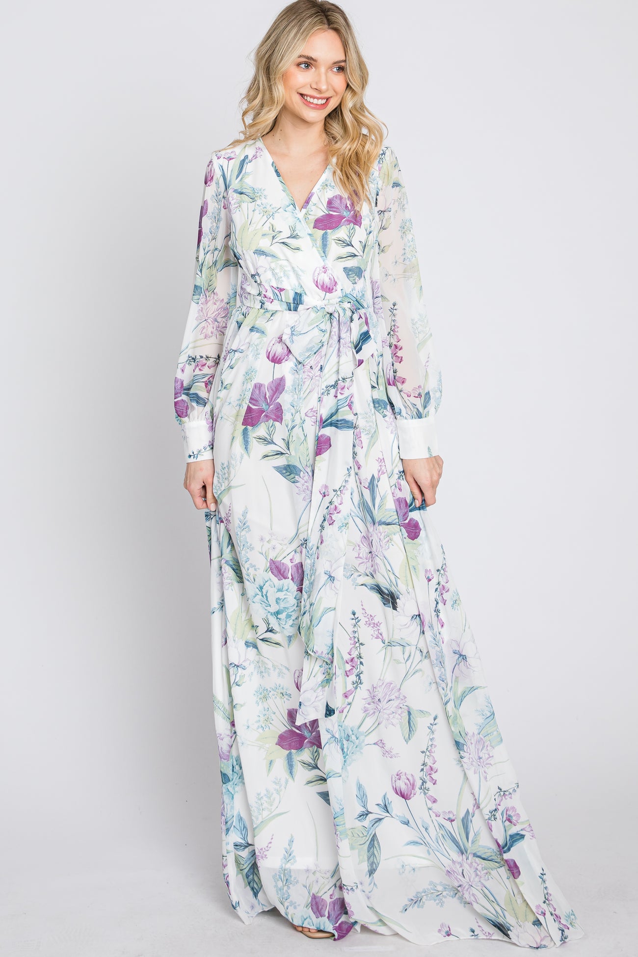 White Floral Chiffon Long Sleeve Pleated Maxi Dress